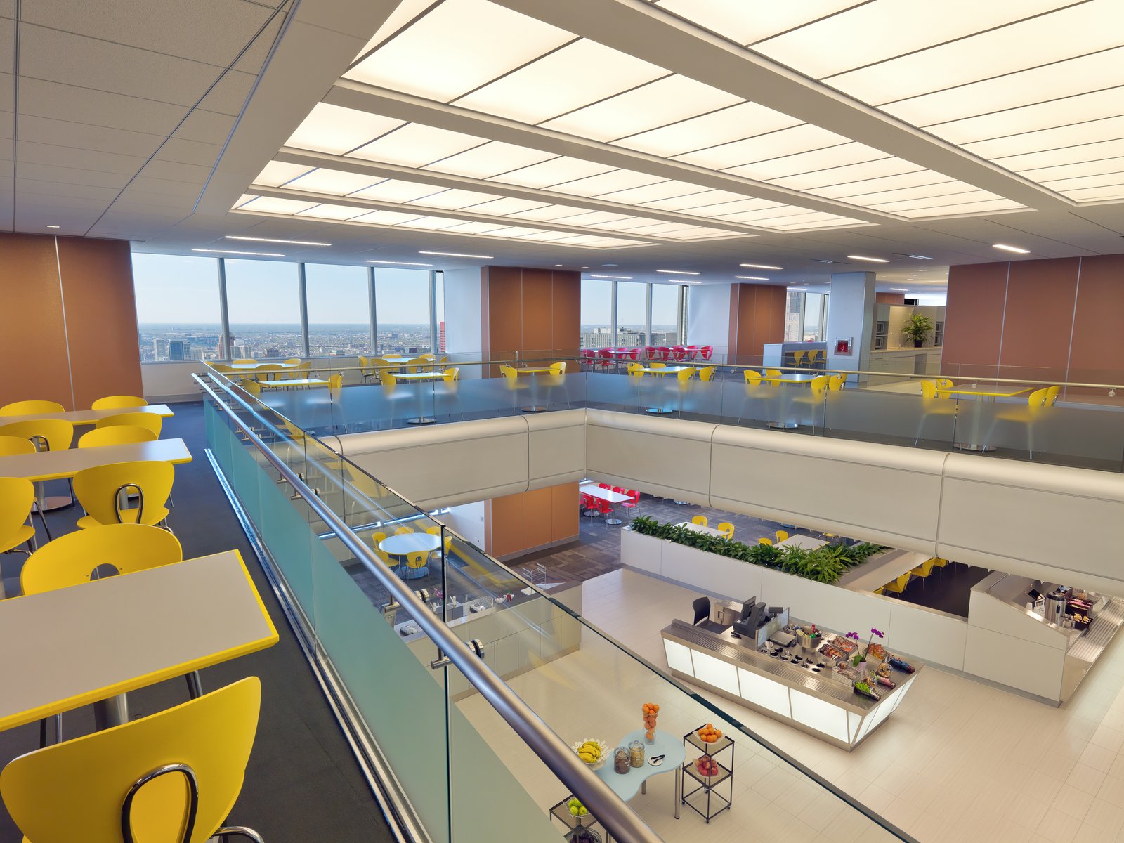 Open shafts add to the transparency while the center atrium bay features an open stair with breakout lounge and meeting spaces. Together, these elements provide a visual and physical connectivity within the company, and an inviting, inspiring space for employees.