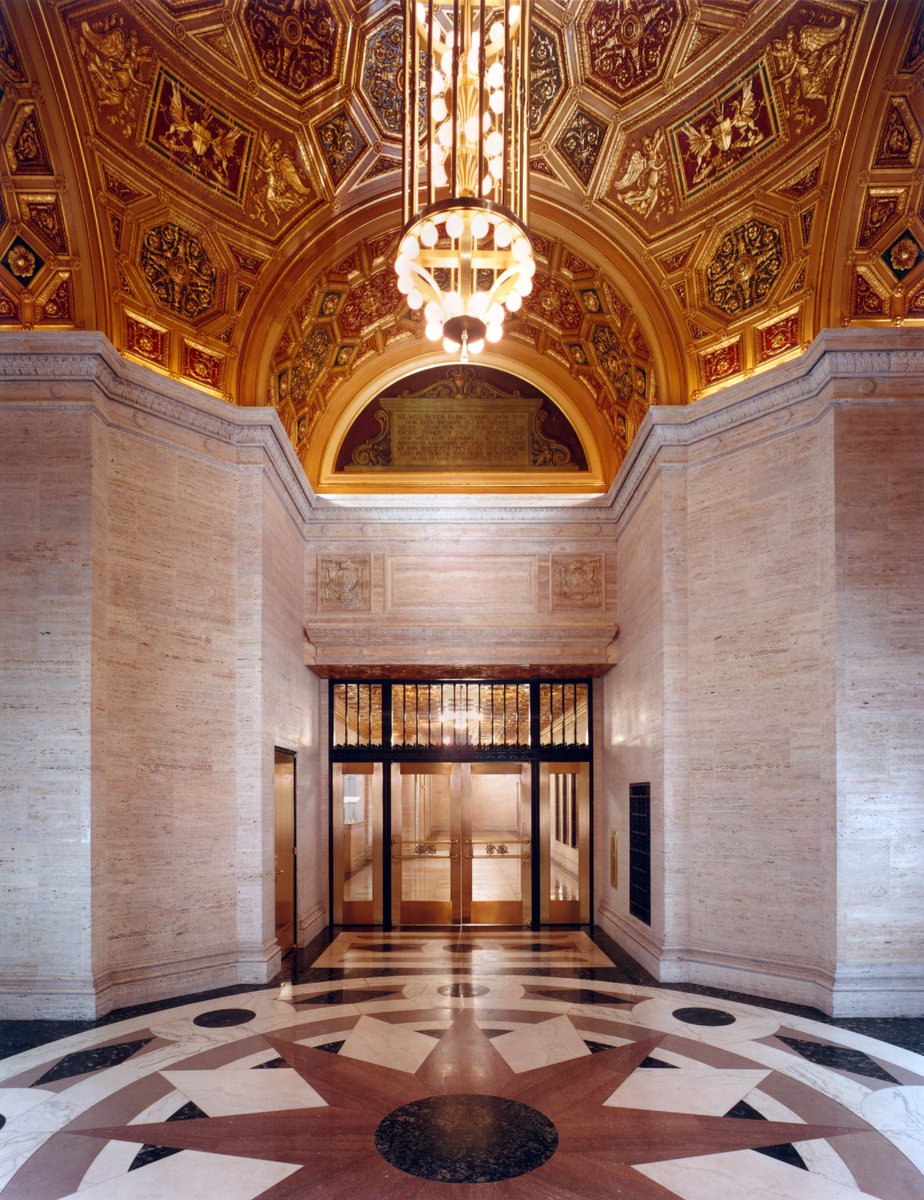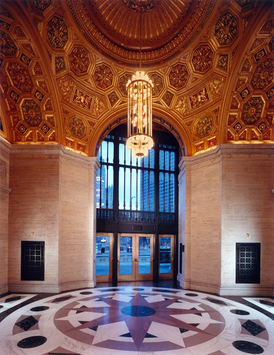 The building’s marble floors and walls were cleaned and refinished. A selection of the original cast elements was used to recreate the ornamental decoration of the original lobby and entrance. The elevator operating system was completely upgraded, and cabs were replaced on all cars in a phased program. Typical floor elevator lobbies, corridors and toilet rooms were replaced or renovated and a base building package of entry doors, ceilings, partitions and finishes was developed and implemented. In addition to these elements, a tenant master plan and marketing plans were developed. Now faithfully restored, the building is once more attracting tenants and the magnificent picture window once again graces one of Chicago’s most important intersections.