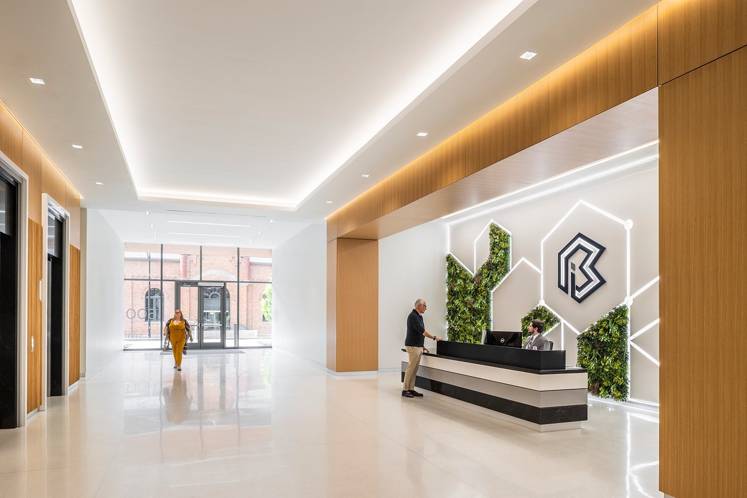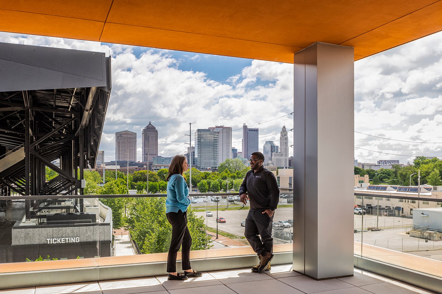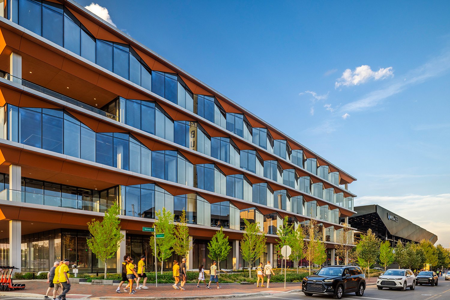 Extending this sense of openness and connection, the design strikes a balance between the need for an iconic presence and the efficiency and adaptability required in a mixed-use environment. Drawing from the energy of the surrounding entertainment district and the natural landscape, the building’s sculptural form establishes a strong identity that feels both contemporary and contextual. Bronzed sunshades add visual depth while reducing glare, and the raised base with an open lobby promotes transparency and accessibility. Outdoor spaces and active programming keep the building lively and welcoming beyond event times, achieving the client’s goal for a distinctive yet community-oriented workplace that remains functional during busy game days.
