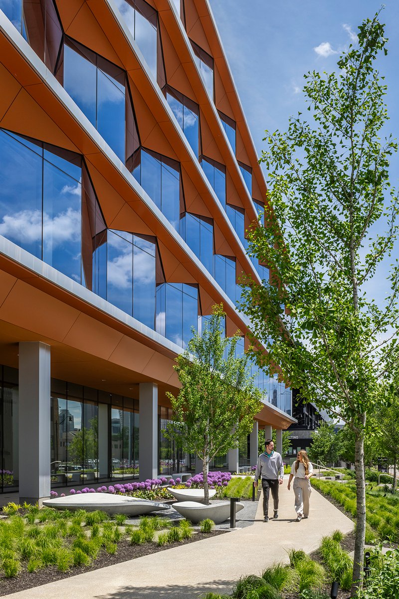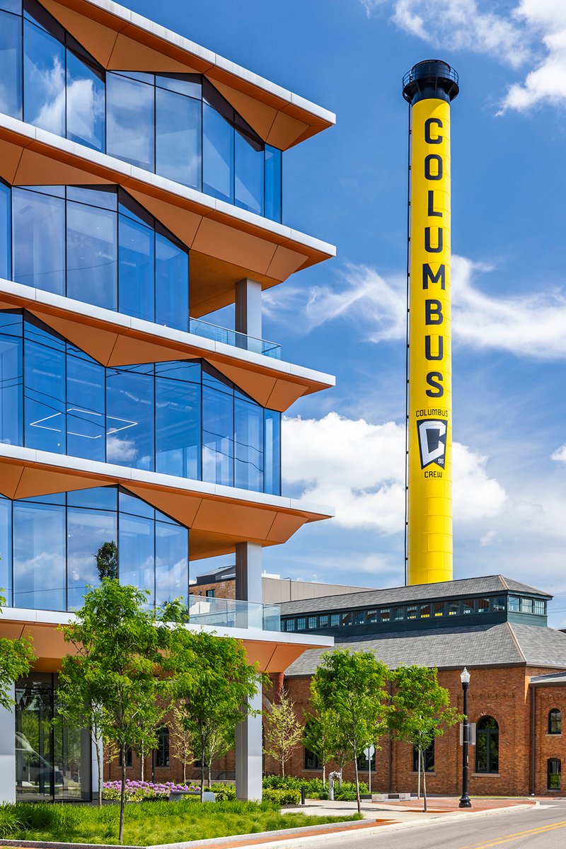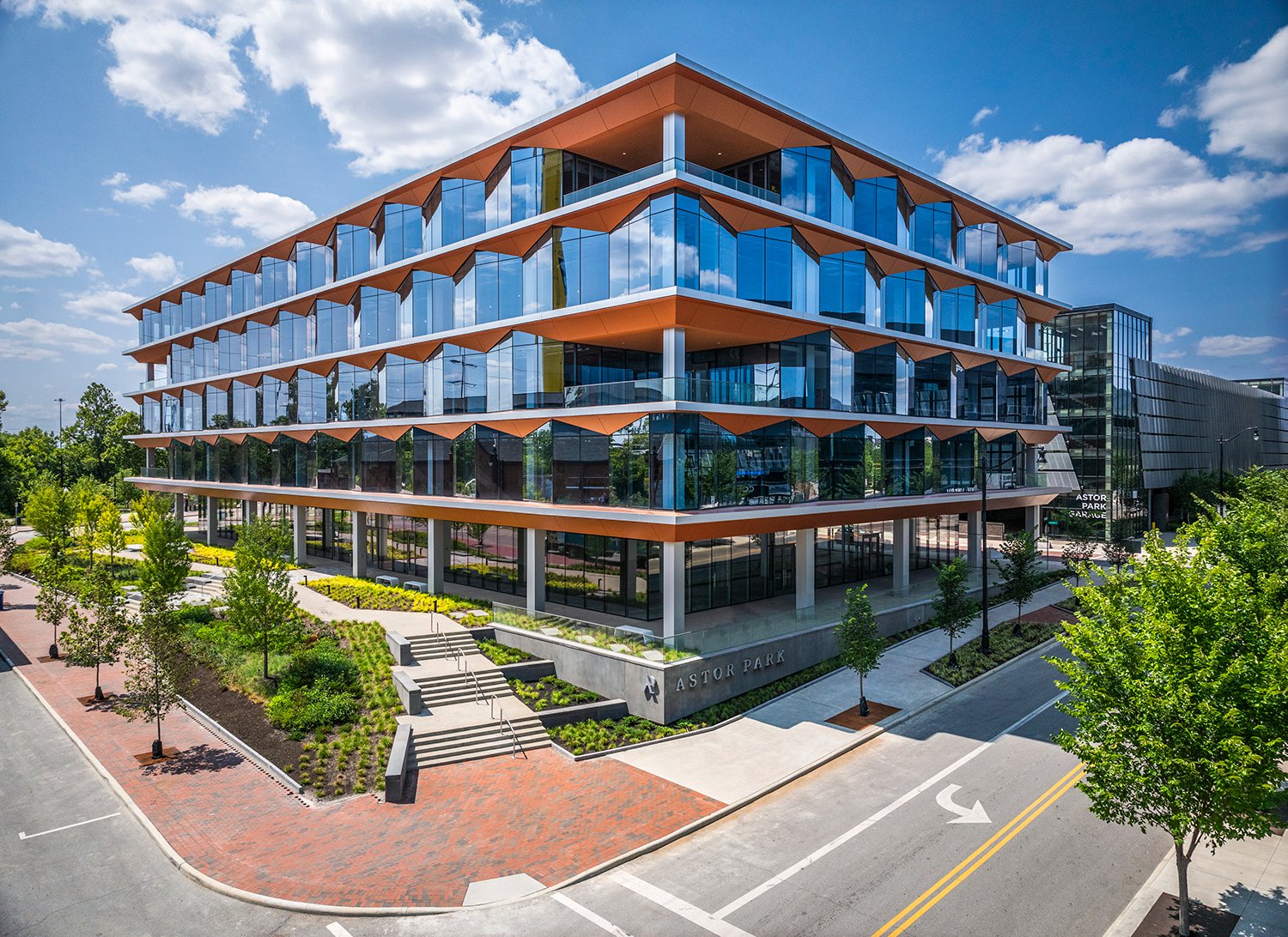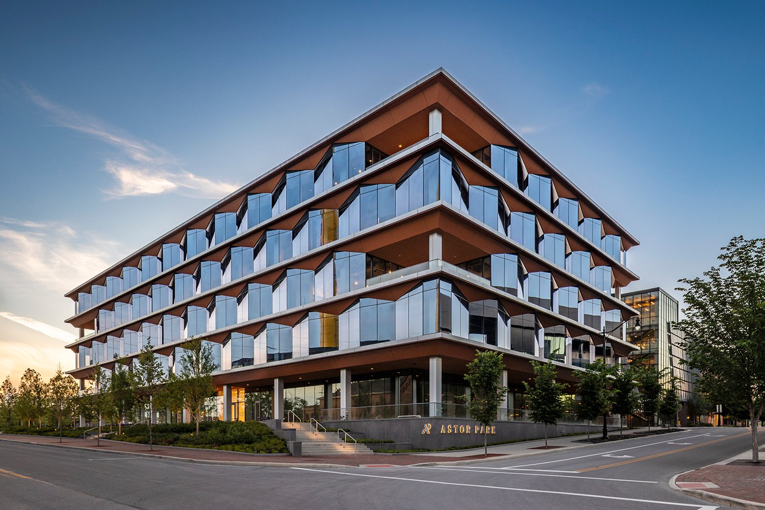 Located in Columbus’ growing Arena District, Astor Park Office anchors a three-phase master plan adjacent to Lower.com Field, home of the Columbus Crew. Its saw-toothed façade design echoes the ripples of the adjacent Olentangy River, capturing movement and light through a distinctive, water-inspired rhythm. Prioritizing visibility, efficiency and connection, the building features outdoor terraces, a midblock pass-through lobby and active ground-floor amenities that invite public engagement. Integrated with surrounding green space, riverwalks and bike networks, the project supports well-being and an inclusive urban lifestyle.
