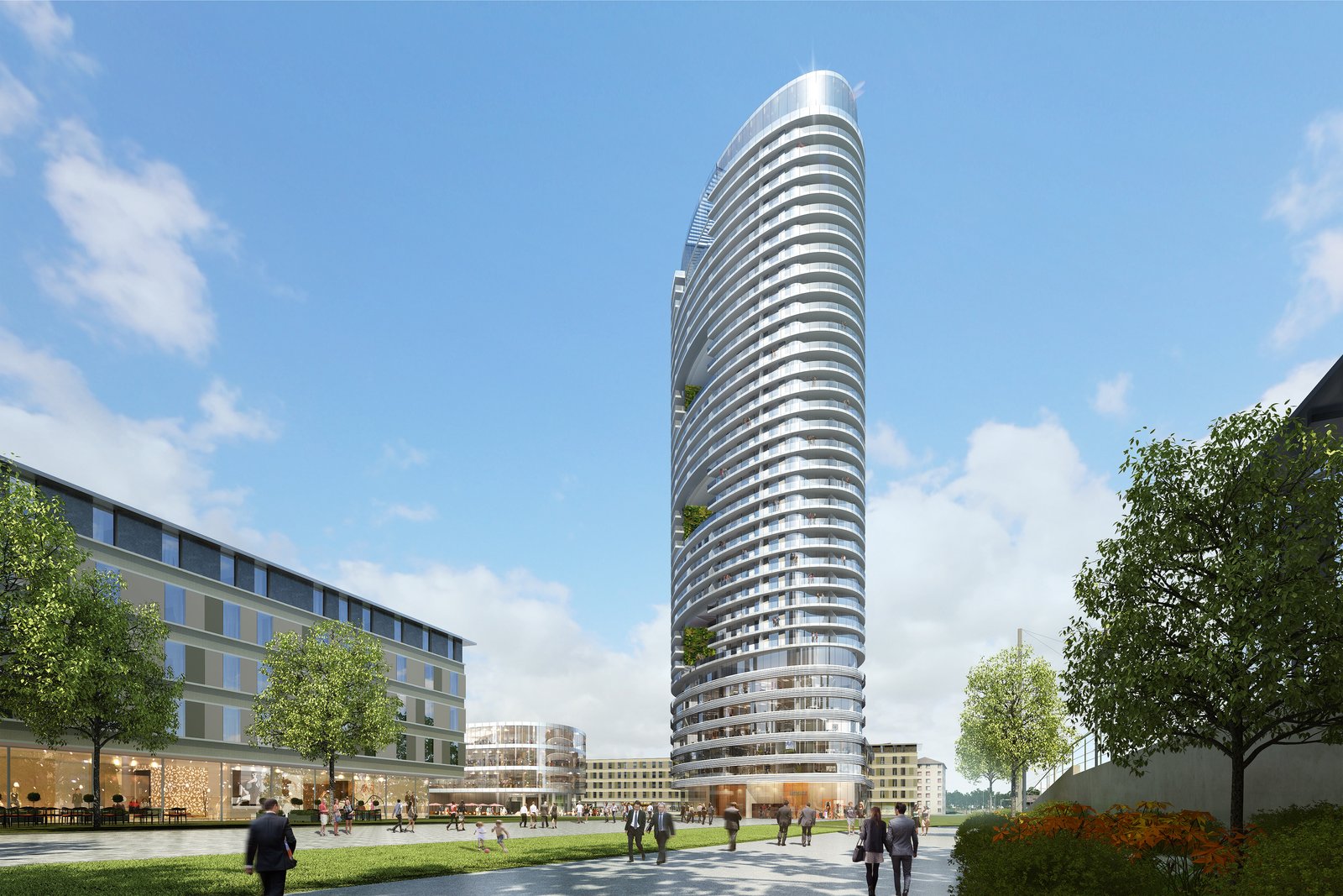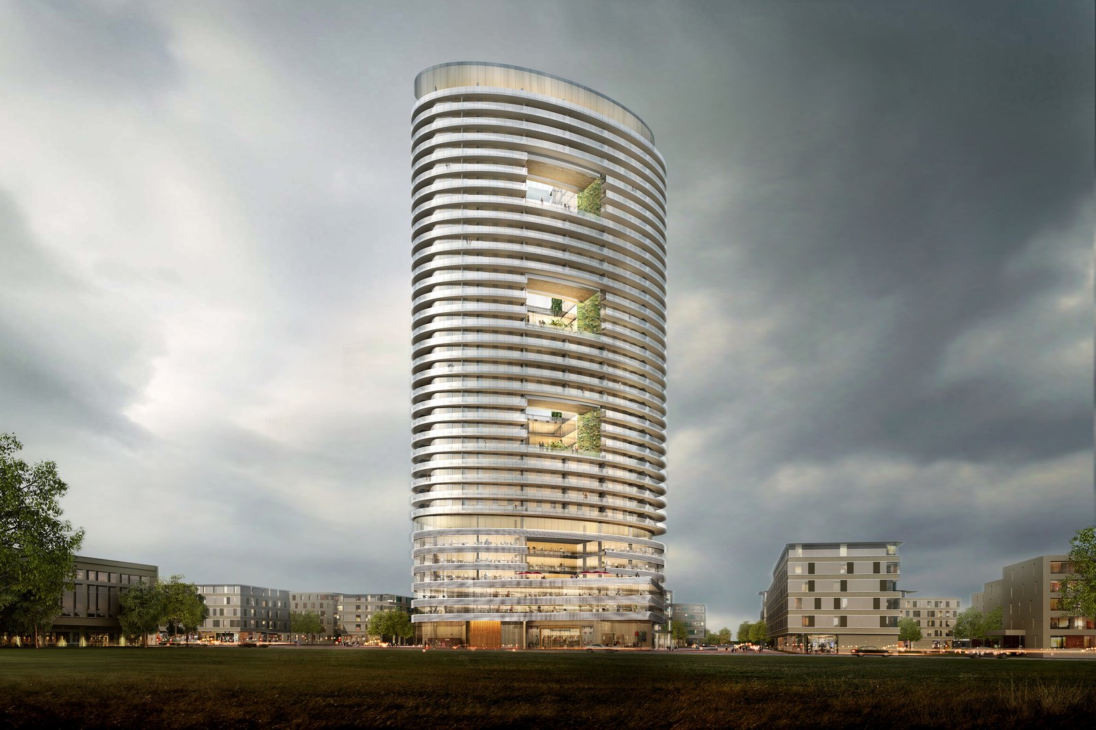The tower and its annex building are positioned in direct relationship to the main square and intended as the focal point of the development. A park located to the north will create a buffer between the low-rise residential buildings, and the public plaza and square and will become an important amenity to the overall development.
