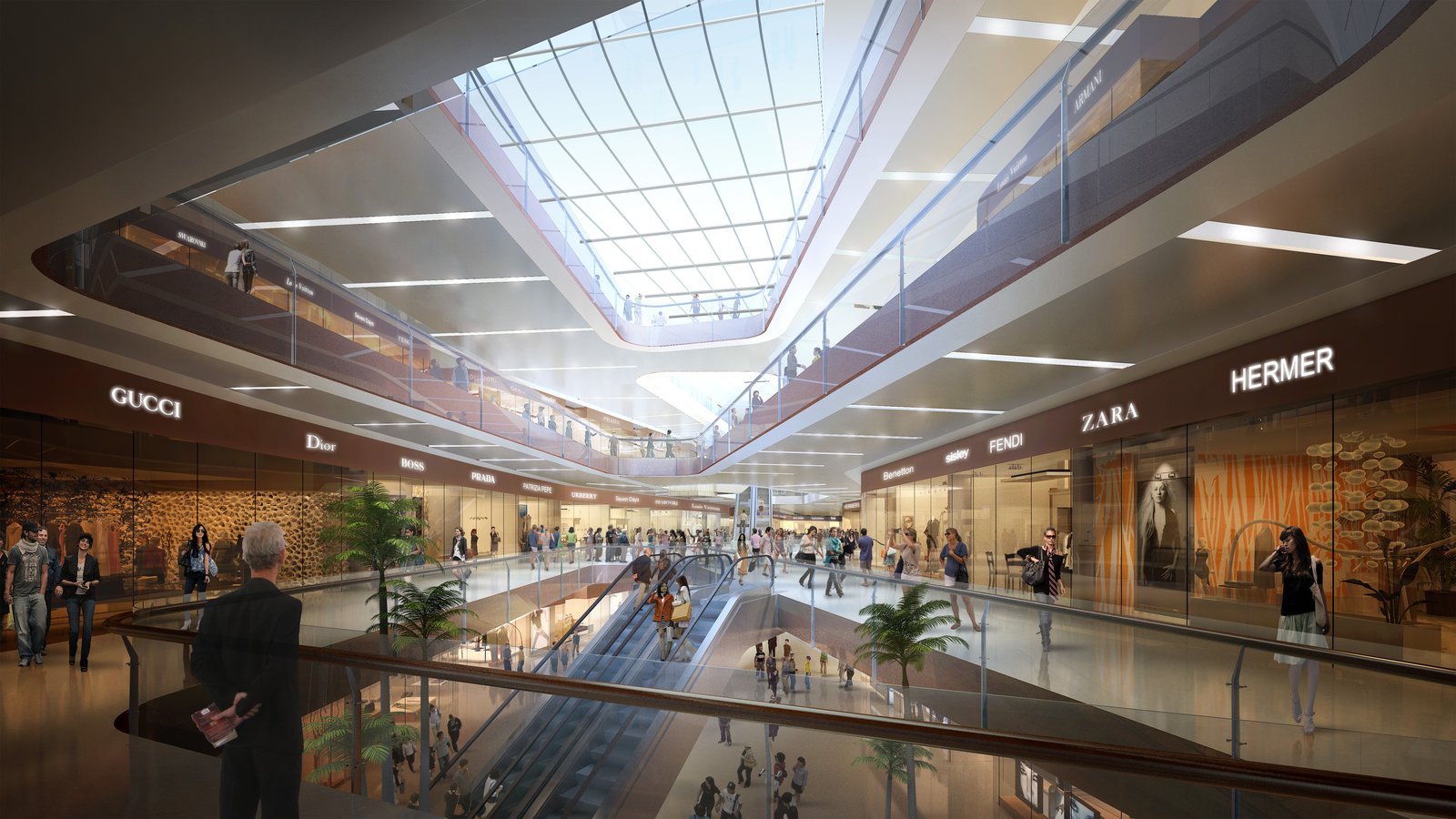 The shifting of building locations is achieved in a push-pull manner, so that each tower is related to the next within the asymmetrical yet balanced site plan. The resulting organization, form and linking of the towers ensures that the development feels like a single, unified place. The plan also defines secondary spaces that create the main internal circulation paths of both the street retail and shopping mall and become open spaces for pedestrian plazas, entry drop-off and below-grade ramp access.