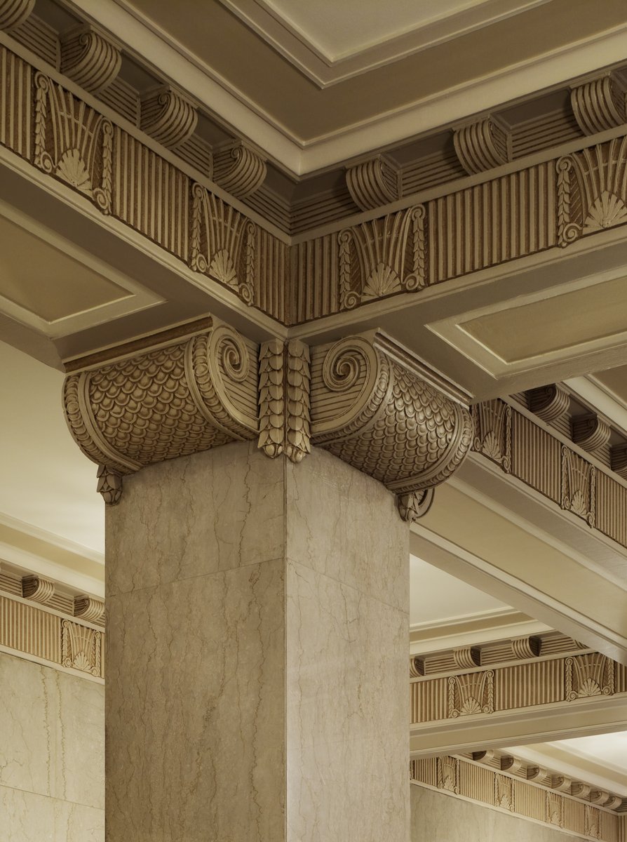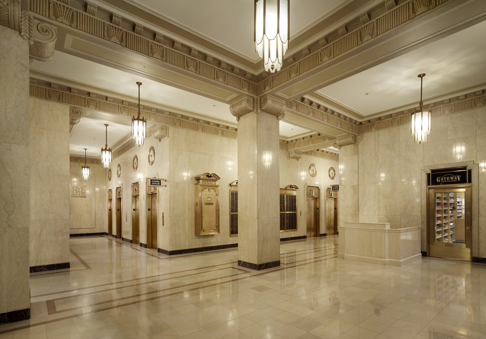 In the office building lobby, the original chandeliers, once modified for a church in Indiana, were restored to the original two tier illumination, glazing and metals were repaired, and the fixtures were re-wired and re-lamped to return to the original illumination color and quality. Rust jacking found at entry doors slabs was stabilized and the floor re-installed. Two rounds to paint analysis by a historic paint consultant were not able to conclusively determine the original paint scheme. Photographs taken of the office building taken when it opened during the early stages of the depression were also inconclusive in their appearance as either a primer white or a subtle color or glazed scheme. Working with local Landmarks staff, the partially gilded non-historic paint scheme was replaced with a subtle glazed scheme based on the paint analysis and photographic evidence.
