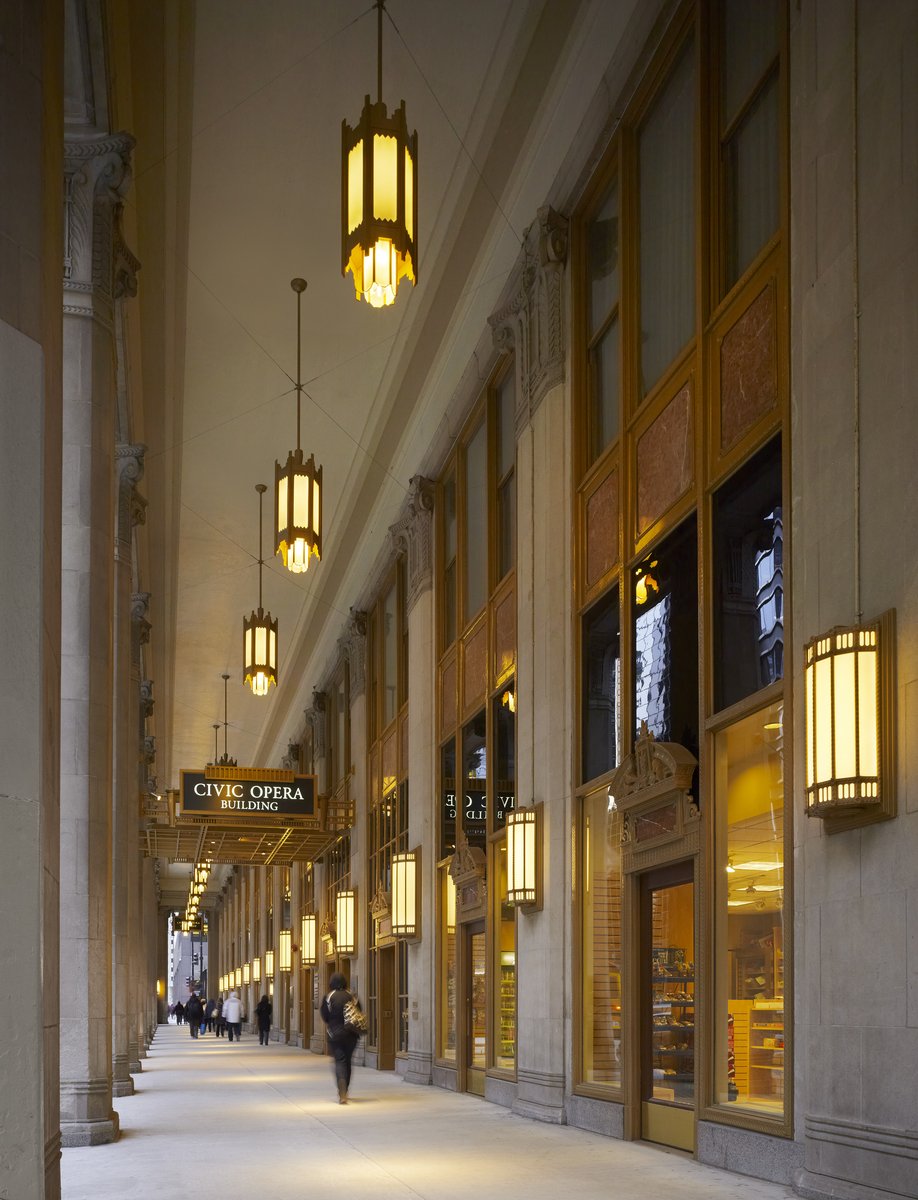 The Civic Opera Building was originally designed by Graham Anderson Probst and White with two major theaters to be supported by 910,000 of office space. Working with the Owners of the office building who have primary responsibility for the exterior façade and the office building, GP was responsible for an existing conditions overview report and master plan that laid out the restoration of the lighting and monumental cast iron storefronts along the portico, street and river, along with the restoration of the office lobby ceiling, painting and lighting.