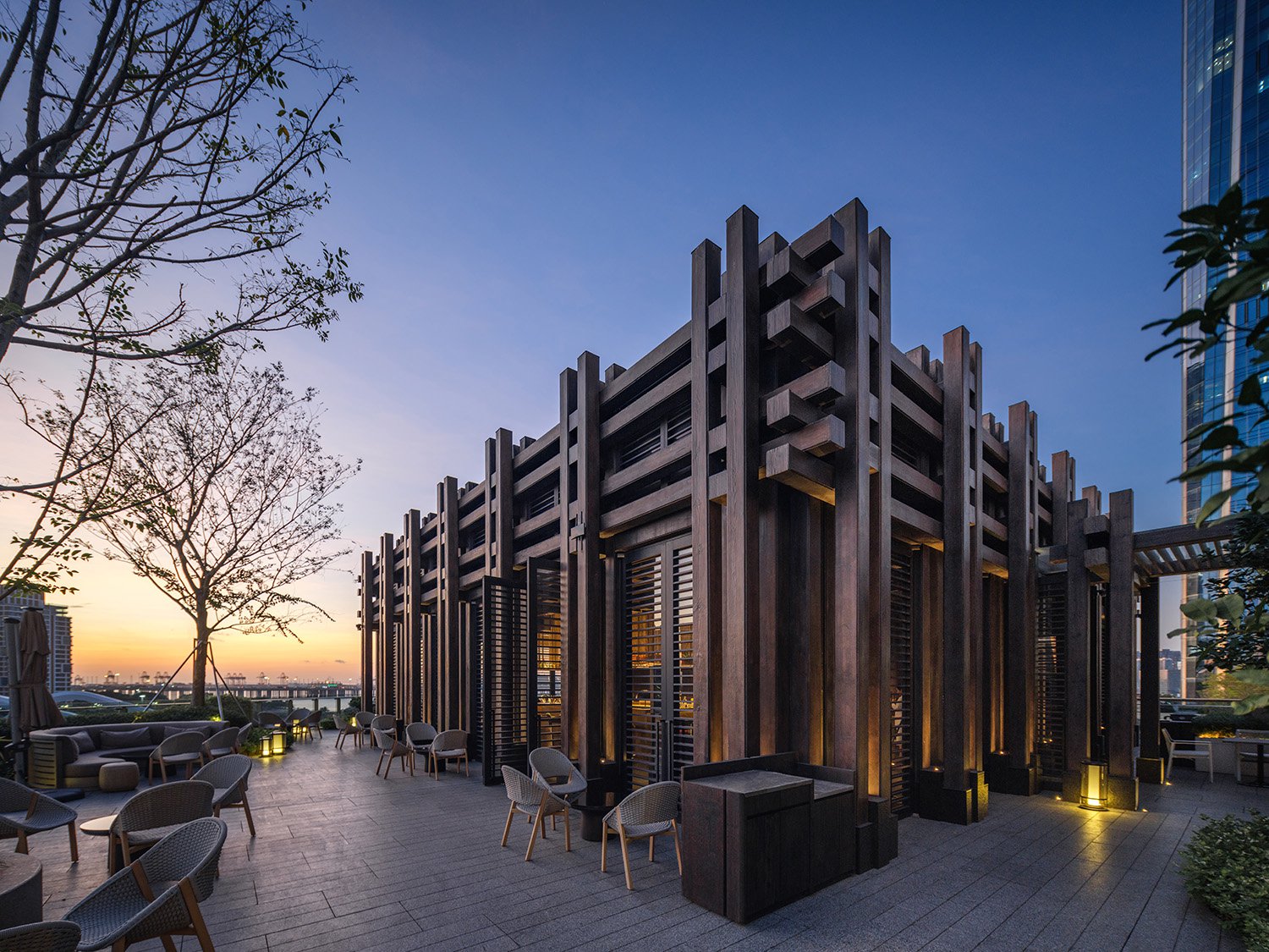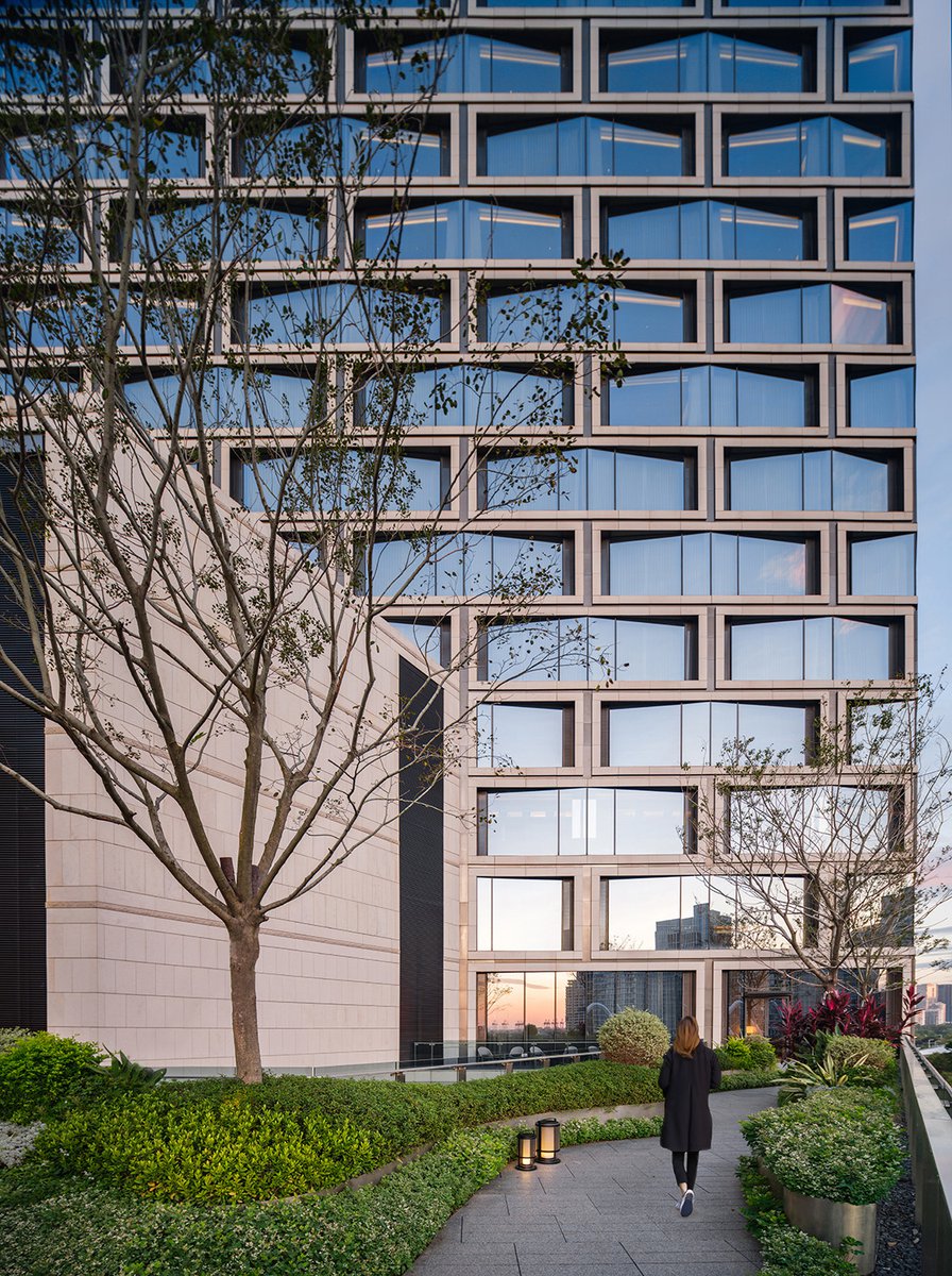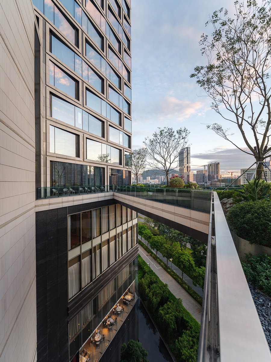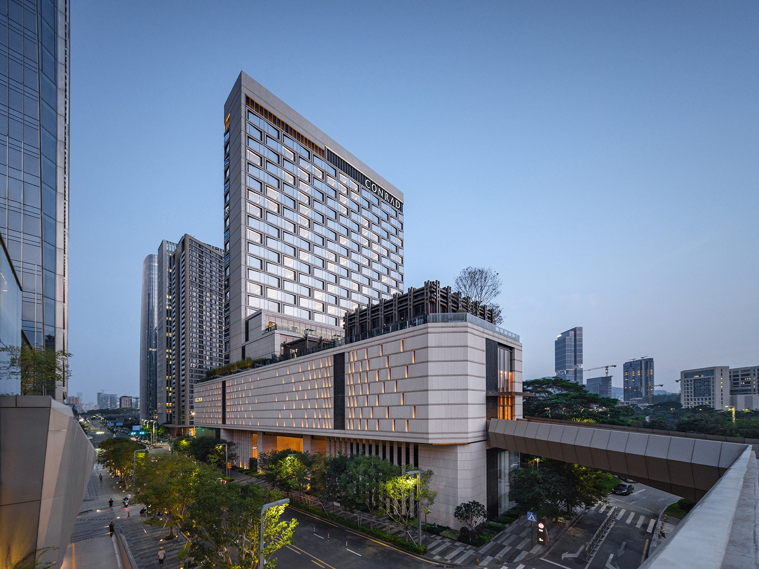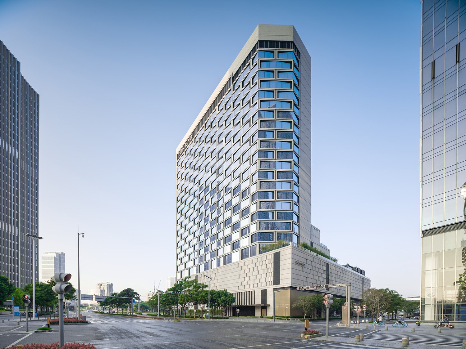 As part of the Hilton family of hotels, the new Conrad Shenzhen is a luxury 300-key property that features cascading amenity floors and landscaped roof gardens along its western side, oriented to provide views of the adjacent green belt and Qianhai Bay. With the parcel bordering the expressway on the south end, the Conrad tower and signage are prominent and visible from a great distance in the surrounding context. The unusual triangular site and challenging setbacks led to a unique design that optimizes views, program location and outdoor amenities.