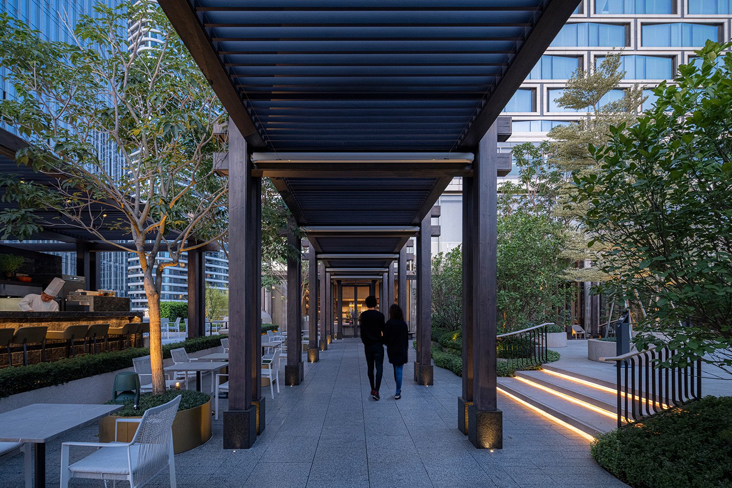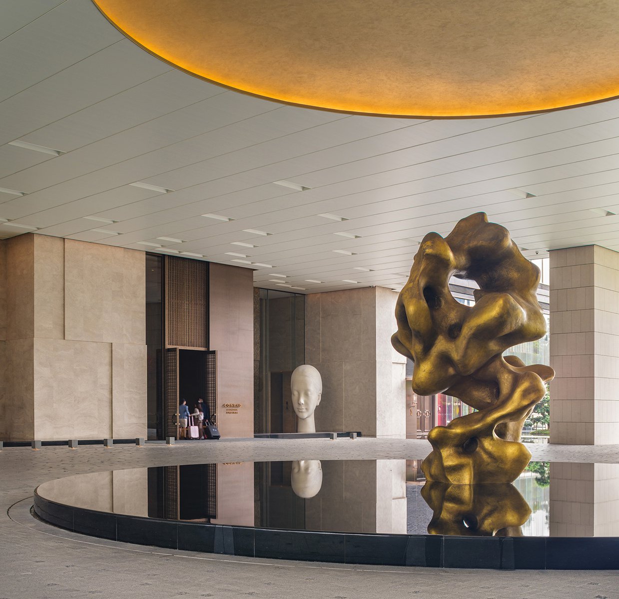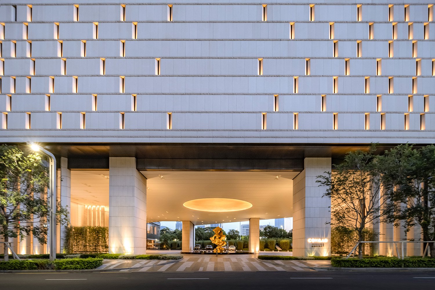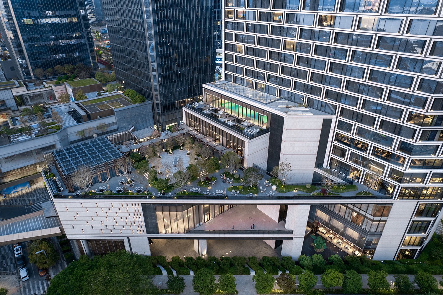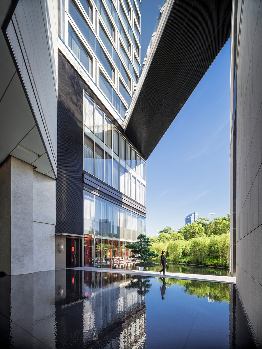 The tower features an offset core, providing a majority of the hotel rooms with views of the bay. A tiered podium defines outdoor space for the ballroom, as well as rooftop areas for the bar, dining and pool. A large porte cochère welcomes guests at the ground level and features large-scale sculptures and landscaping that help create a serene, elegant atmosphere within the bustling city.