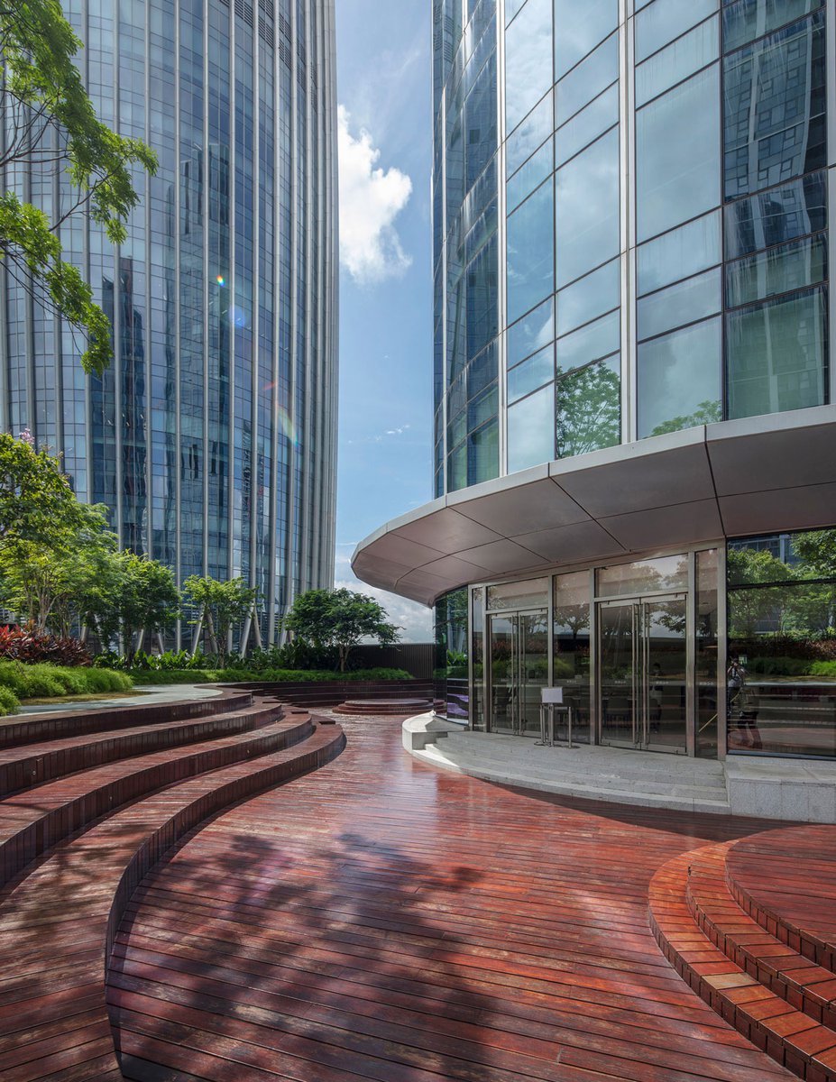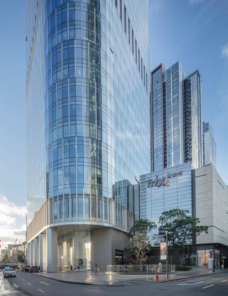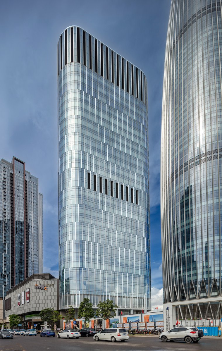 The CR Financial Headquarters is located in the Moon Bay district of Shenzhen, China. It is one component of a larger master plan that includes two residential towers, the Andaz Shenzhen Bay hotel tower, a large multi-parcel retail podium, and the China Resources Headquarters tower, also known as the “bamboo shoot.” The triangular shape of the CR Financial tower plan is designed to maximize unobstructed views to the neighboring greenbelt and the ceremonial gardens to the northeast while orienting the arrival arcade parallel to the south entry road. A consistent radius has been applied to the three corners, softening the form and achieving a continuous surface for the shifting pattern of exterior verticals to resolve themselves in a balanced and rhythmic manner, reminiscent of the fluidity and quiet motion of the nearby Shenzhen Bay.