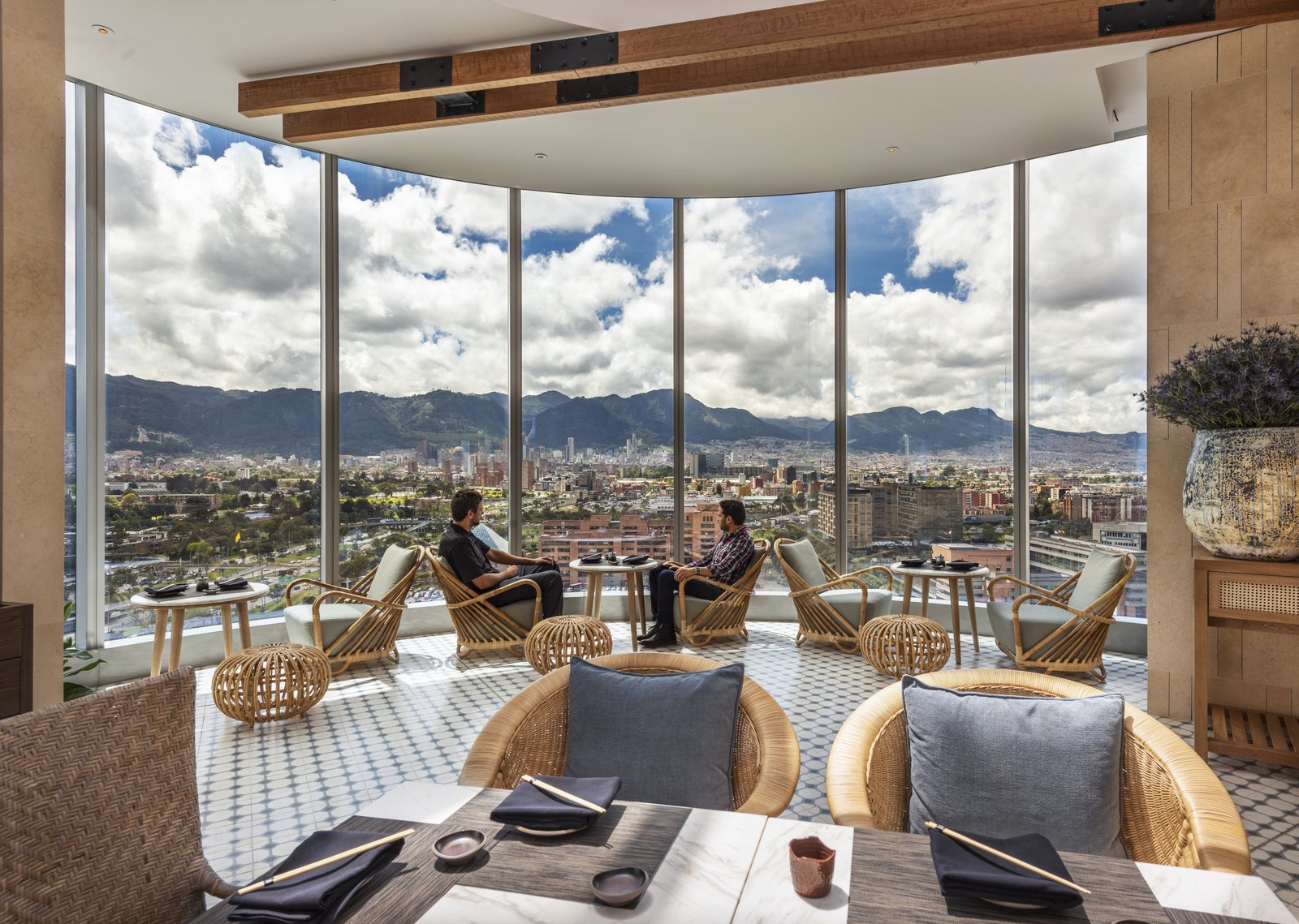 Rising from the podium base, the 70-meter-tall elliptical tower is designed to contrast with the rectilinear office towers of the surrounding complex. The curving façade creates a symbolic center to the complex while gesturing toward the city center and opening up views from the guestrooms to downtown. The taut, reflective glass façade symbolizes the arrival of the modern and progressive city of Bogotá. Capping the tower is an indoor-outdoor restaurant and bar that provide expansive views back to the city center as well as the surrounding mountainside.