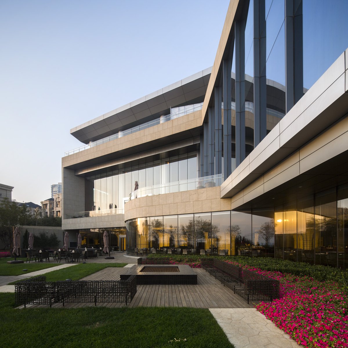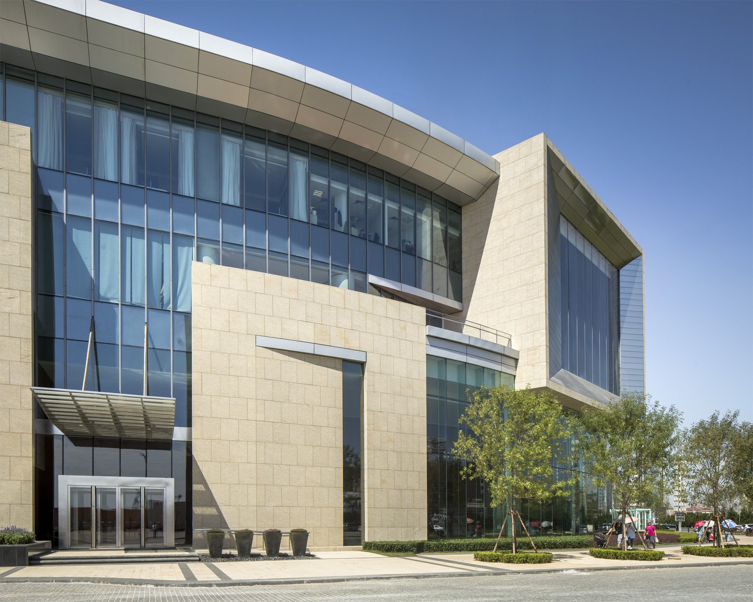 The tower's facade is composed of floor-to-ceiling high-performance glazing to maximize the views, and horizontal metallic sunshades are sized for solar protection and privacy. In contrast, the building’s four-level podium is clad in a mixture of warm limestone, stainless steel and high-transparency glass that relates to the scale and materiality of the neighboring residential villas.