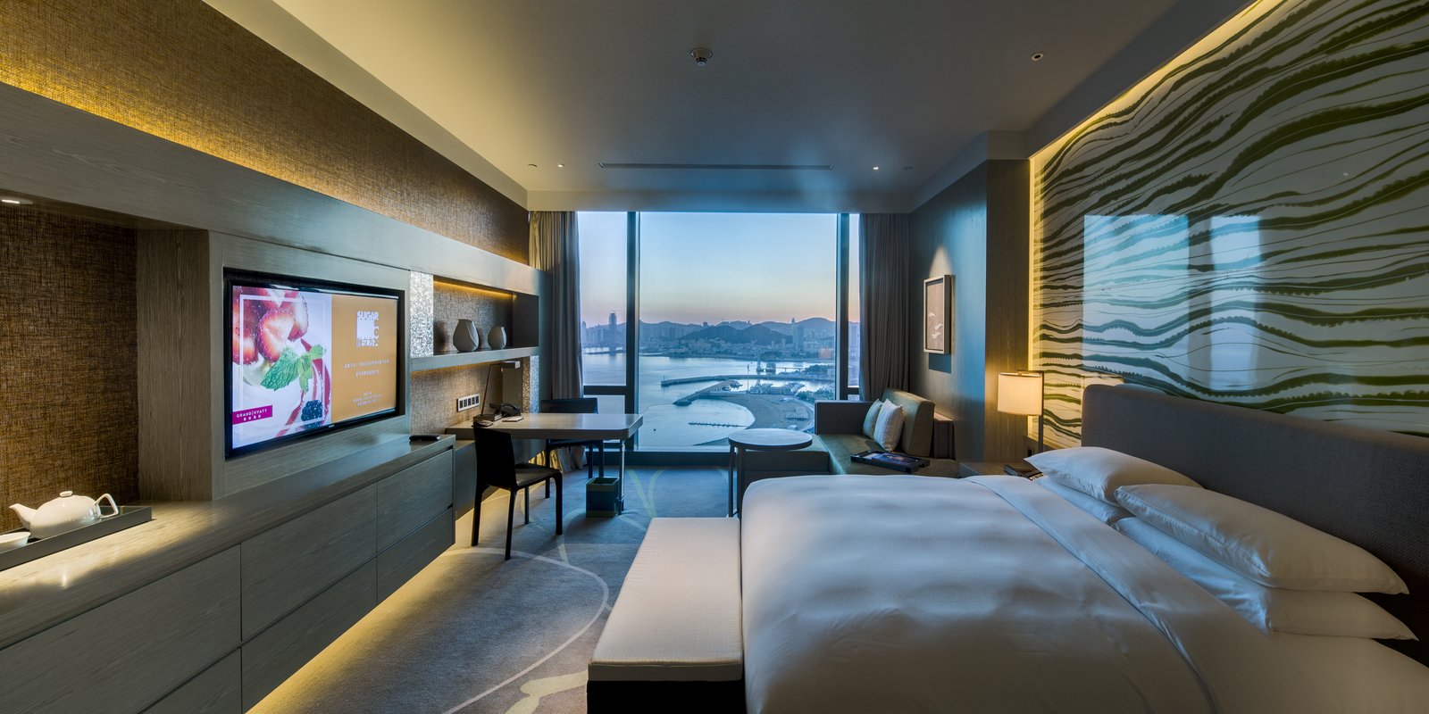 Located in China's northeastern coastal city of Dalian, this 370-key hotel and 84-unit serviced apartment tower sits unobstructed overlooking the Yellow Sea to the south and China’s largest public plaza, Xinghai Square, to the north. Reflecting its unique site, the building’s design responds to both its physical and environmental context. The tower’s triangular plan ensures that all rooms receive southern light as well as views of the sea and nearby mountain ranges. Additionally, the triangular form helps to mitigate the impact of the area's uniquely high winds, channeling them to the building's northern corners and minimizing the structural impact on the slender tower.
