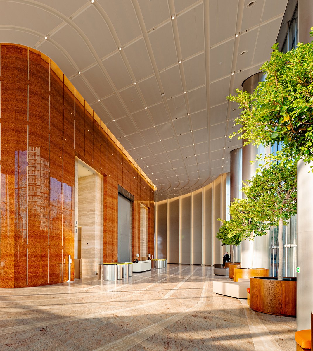 The taller building has a three-story lobby with a cable-supported enclosure, utilizing a transparent glazing that blurs the boundary between interior and exterior space. The tower core is clad with large stone slabs that accentuate the solid mass of the core, in contrast to the lightness of the building’s lobby.