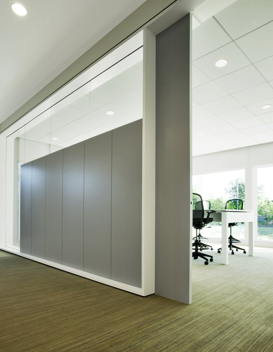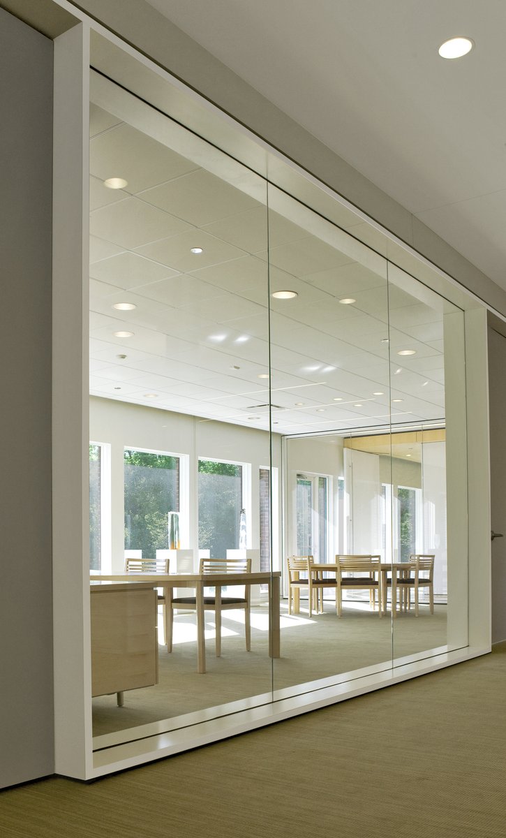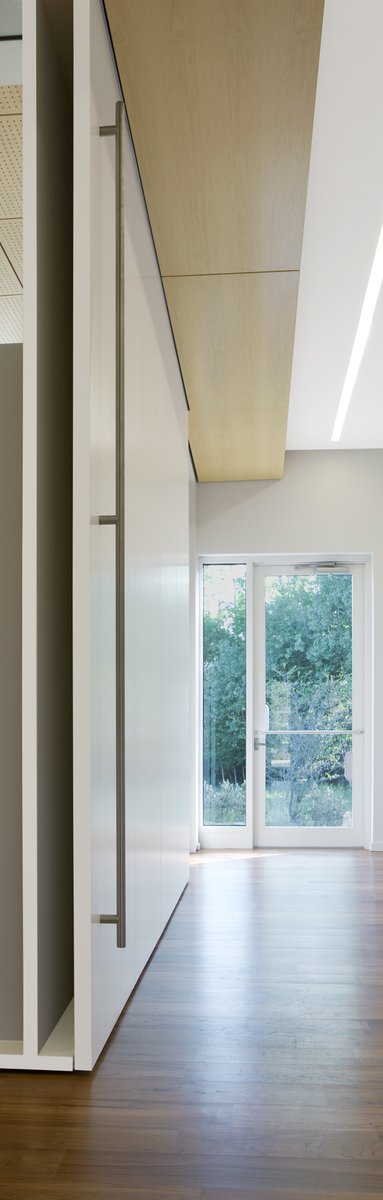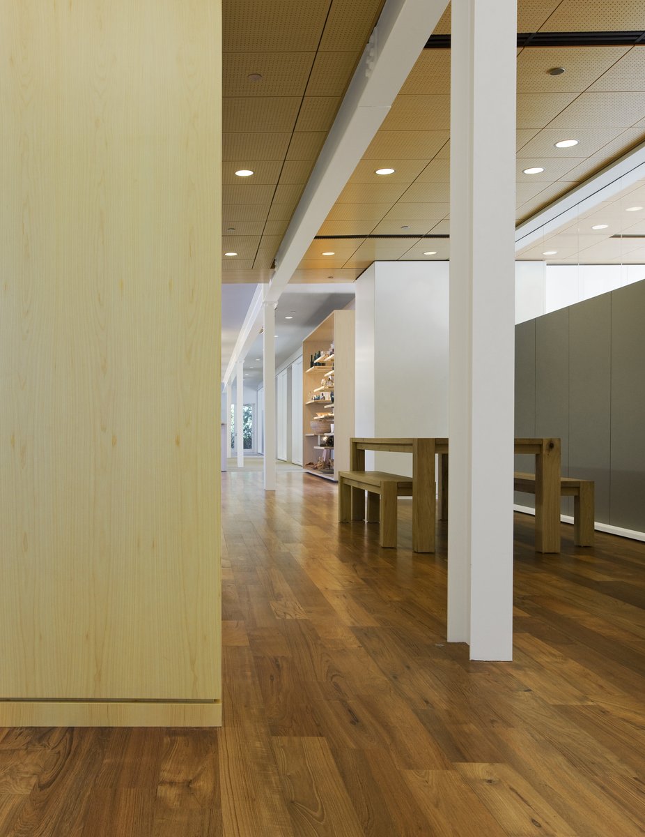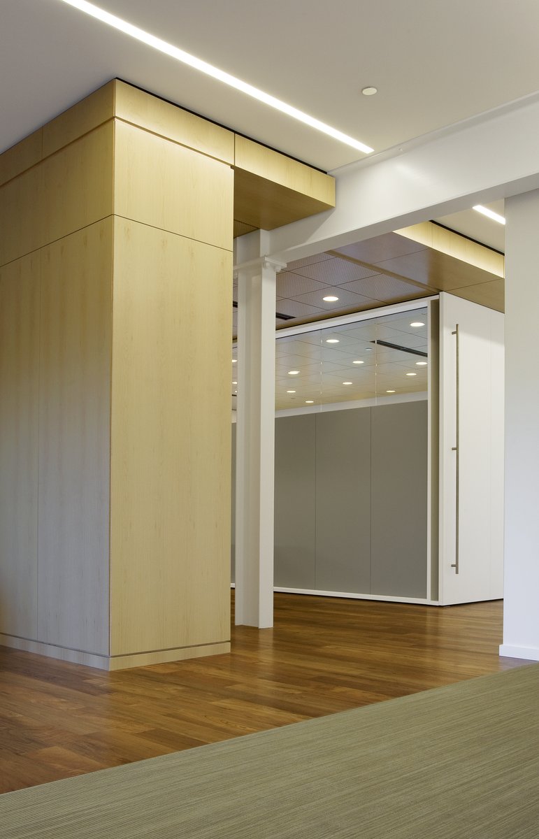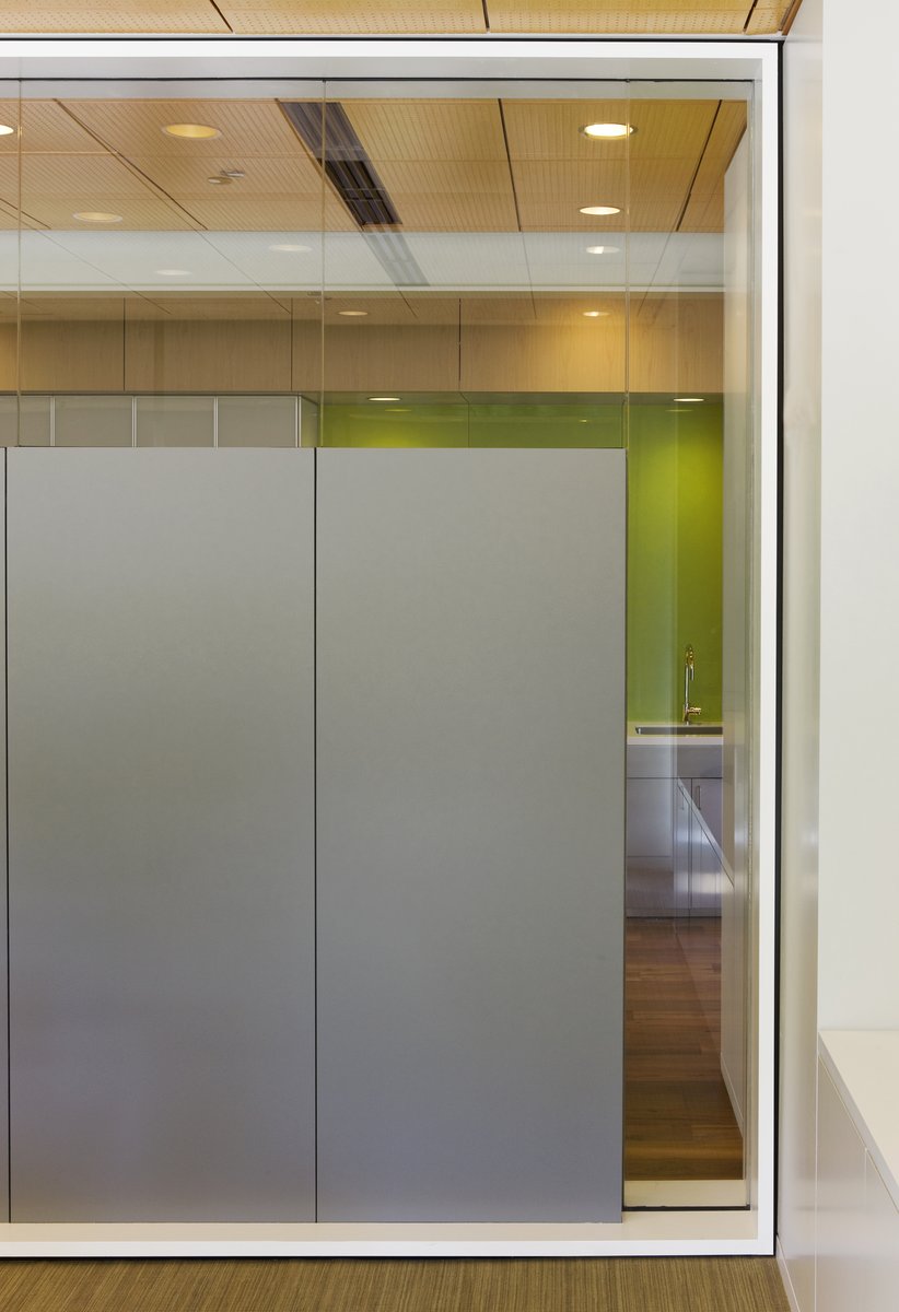 Inserted into a single-story, speculative office suite, the 7,500-square-foot facility is organized around three compositional elements: the colonnade, created by the building’s exposed structural steel columns and central ridge beam; full-height glass screen walls; and a custom maple “pavilion.”
