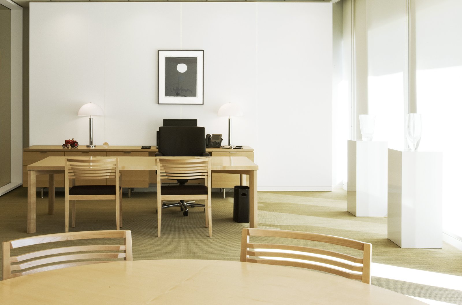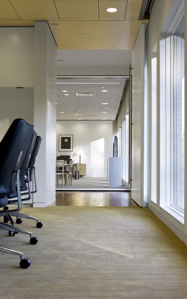 The simple, classic interior composition of thin glass frames and bold, clear millwork forms rendered in a timeless color palette—all awash in natural light—creates a platform in which the appreciation of fine art, design and nature enables a pioneering entrepreneur to continue his lifelong passion for creating business value through design.