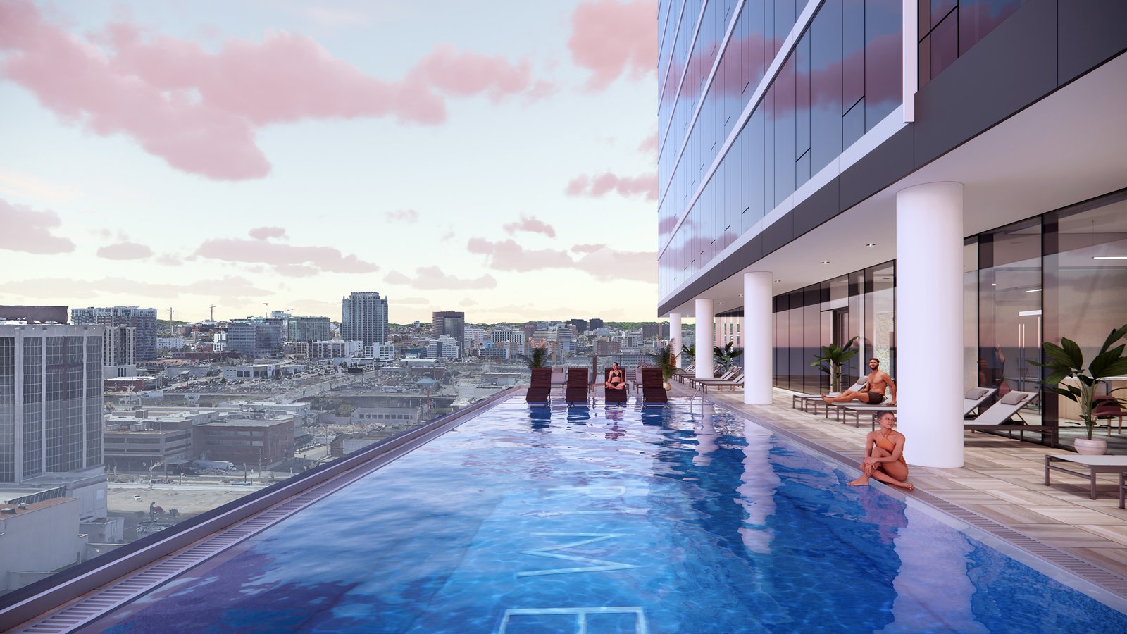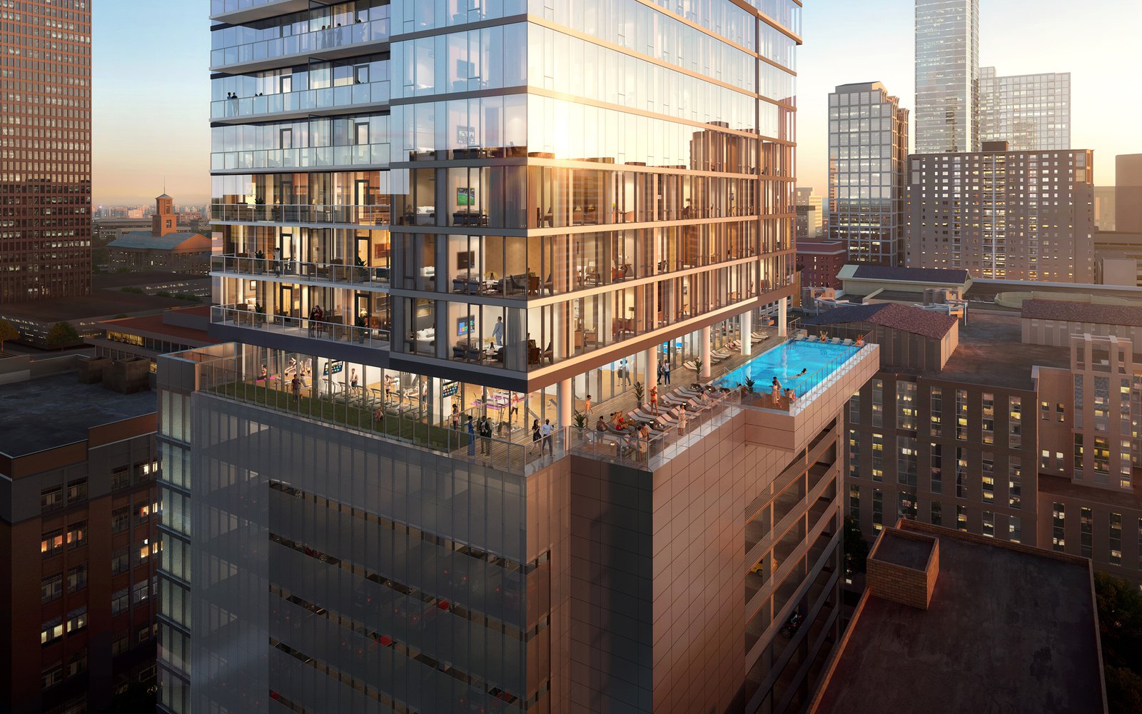 A full floor of amenities sits above the podium at Level 11, with an outdoor deck that surrounds the tower on all four sides. The south area features a pool and sundeck while the north incorporates trellis-covered lounge seating overlooking Church Street. The west deck is reserved for a dog park.