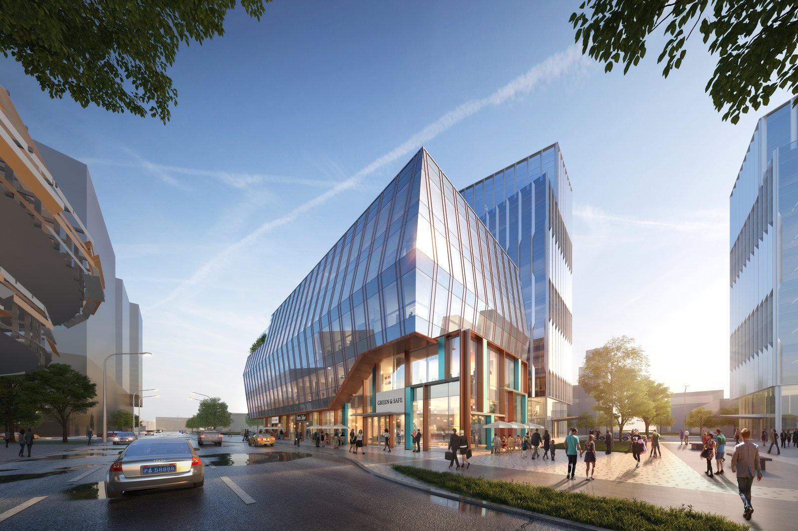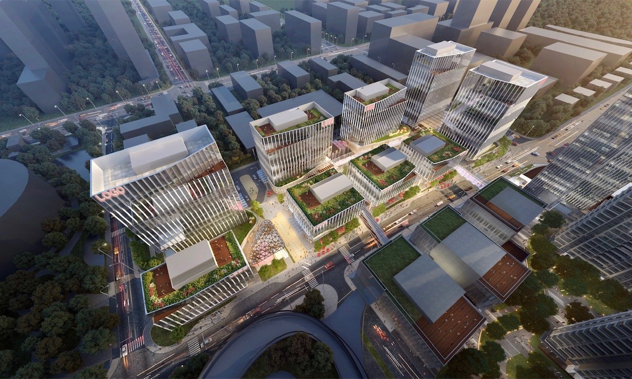 Cangwu Road spans the entire eastern perimeter of the project. Four office villas are positioned above two-story retail facades, ensuring that the appropriate scale of the vibrant street is maintained. Second-level pedestrian bridges span across Cangwu Road, connecting the project to the neighboring retail, office and residential buildings. Closely located near mass transit, the project offers easy access and is intended to provide a vibrant atmosphere with a full range of amenities.