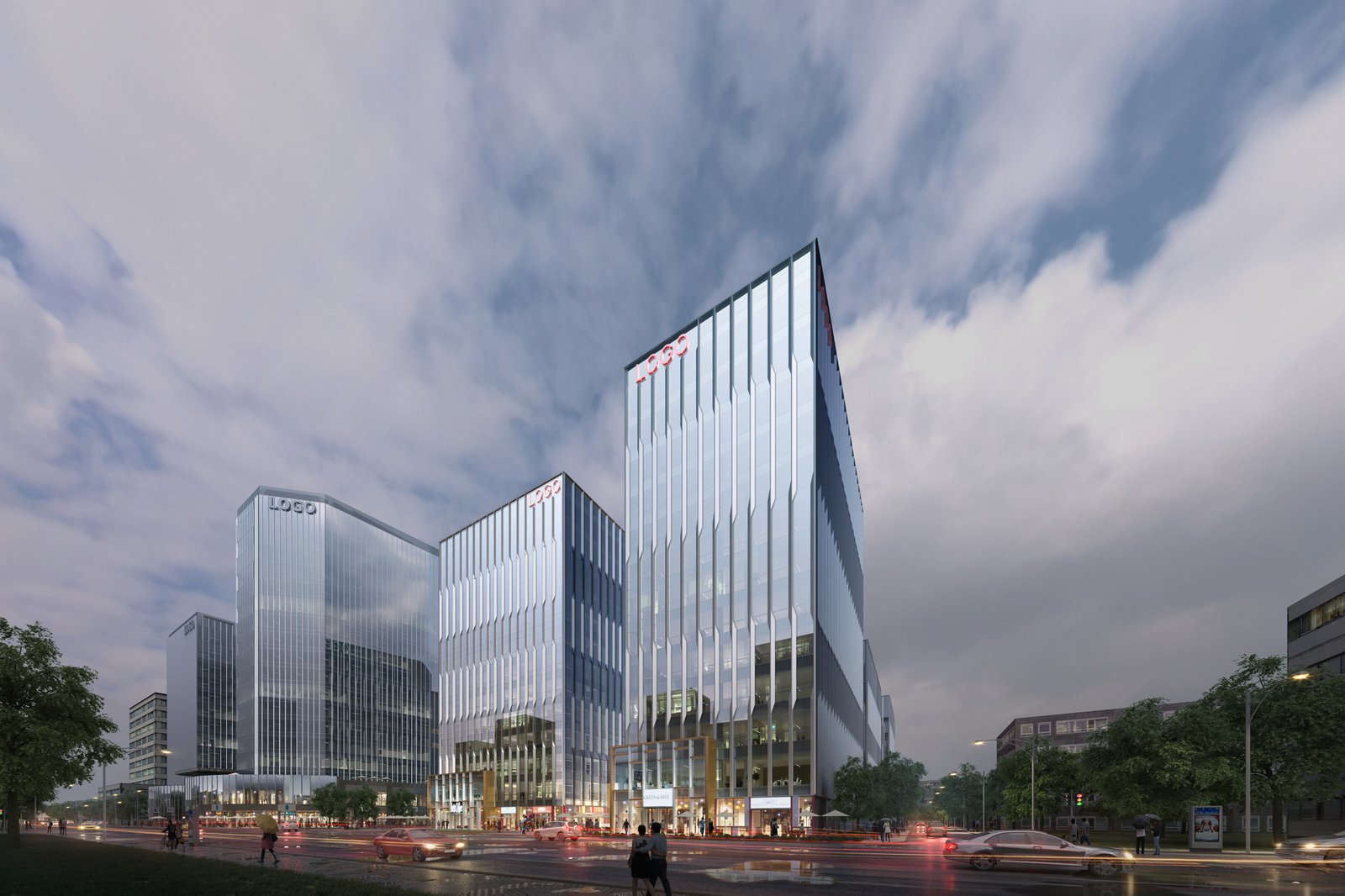 Tianlin Road defines the northern perimeter of the development. Two 60-meter-tall office towers are located along this edge, and are intended to create a “gateway” into the complex both physically and symbolically. The twin towers feature outdoor terraces and unique façades that establish the architectural language for the other seven office structures. The towers are separated by a large sunken courtyard, which provides access to the basement retail as well as directing pedestrians south toward the central event space under a large canopy. There are two additional sunken courtyards within the complex. The southernmost of the sunken gardens opens toward Cangwu Road and provides access to the pedestrian tunnel connecting to the neighboring cultural center.