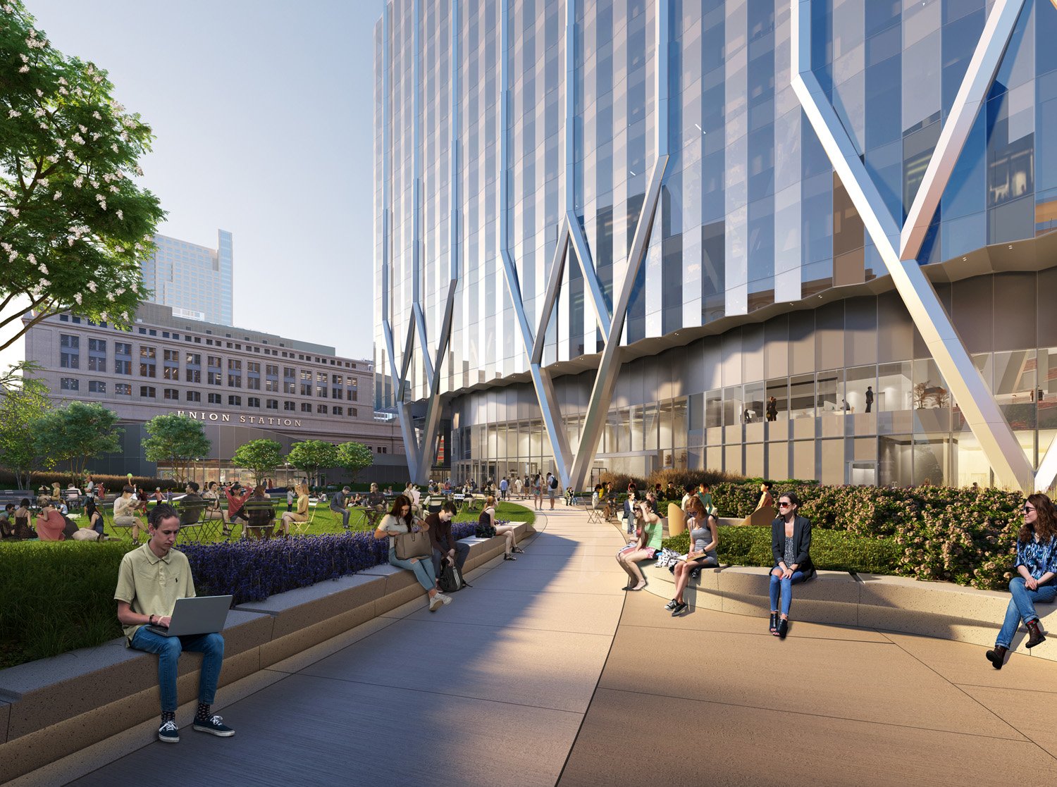Union Station Tower is designed as a stepped, three-tiered building approximately 700 feet tall. The building is oriented in the north-south direction along the east side of its site and features a subtly folded façade. The east face of the building aligns with the property line, reinforcing the urban street wall defined by the historic headhouse on the adjacent block. At street level, the new tower’s primary façades express V-shaped structural transfers, which open up the ground floor. In this way, the park becomes an integral and welcoming part of the building and its entry sequence, and the building serves as an extension of the park.