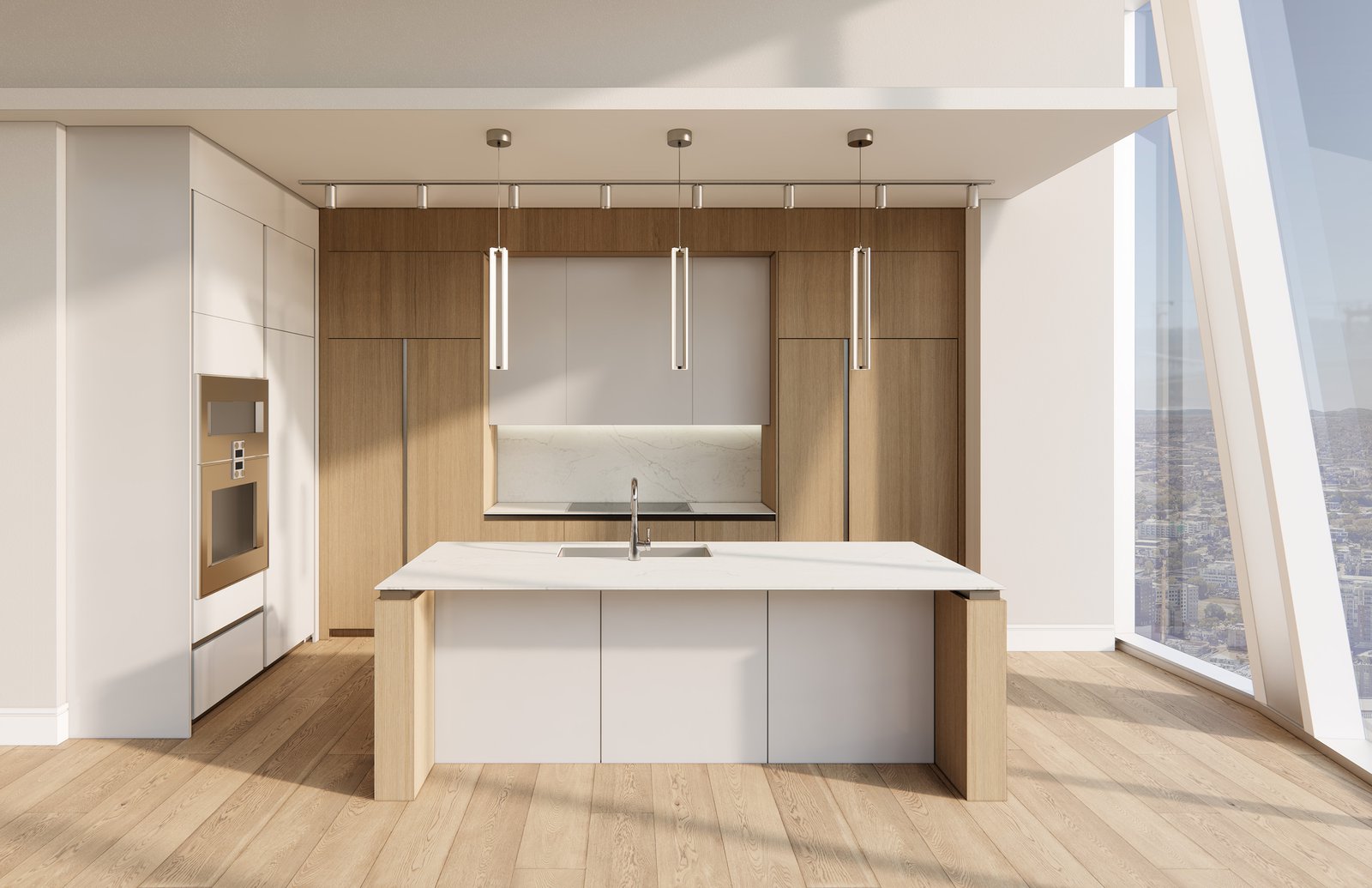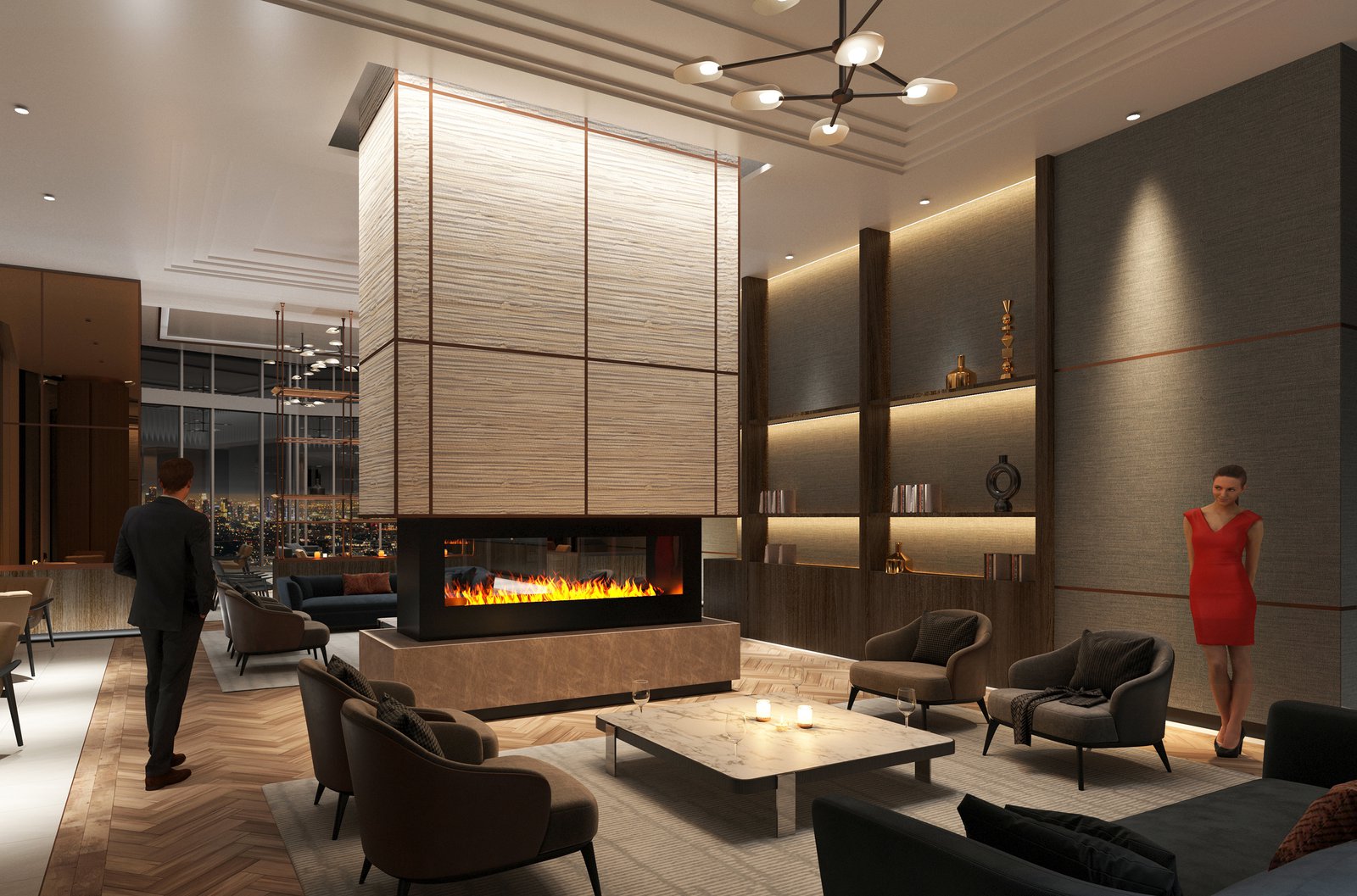 The ground floor consists of a 30-foot-tall clear-glass lobby facing Church Street and a circular-drive porte cochere that creates a dramatic entrance, emphasizing the style and sophistication of the building. A full floor of amenities on level 9 includes a residential lounge and TV room, casual lounge with demonstration kitchen, 14-seat private dining room, fitness and yoga room, game room with billiards table, co-working space with three private study rooms, and a 16,000-square-foot open deck with a pool, 66 lounge chairs, four six-seat cabanas, four grilling stations, and an outdoor exercise area. Level 40 offers dedicated condo amenities including a lounge and bar area with a 23-foot ceiling, fireplace room and lounge, and 25-seat private dining room and catering kitchen. Additional amenities include a bike room, dog spa and an enclosed parking garage.