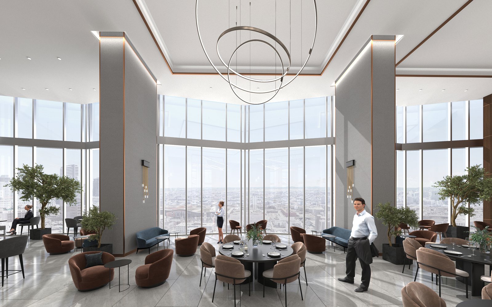 The tower is positioned on the site to optimize view corridors on all four sides while maintaining distance from the new Amazon headquarters and Alcove and Prime towers. By differentiating the base, shaft and top of the building, the design establishes a distinctive presence downtown. The building form is envisioned as a series of faceted surfaces. Different angles of the glass façade reflect light in multiple directions and reinforce the building’s verticality. The culmination of the building form is the “crown”—a series of triangular glass surfaces that create a diamond shape and are reserved for the top four floors, including the most exclusive residences.
