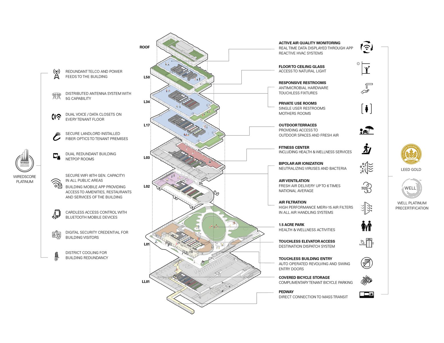 Well before the Covid era, GP held a longstanding commitment to tenant health and wellness. At 320 South Canal, design strategies emphasized improving occupant wellbeing, with the building achieving LEED Gold certification, WELL Platinum precertification and WiredScore Platinum certification. The tower incorporates innovative technology to maximize occupant health, mitigate risk related to harmful environmental factors, and enhance tenant operational efficiency. Select features include advanced air monitoring and air filtration systems, bipolar air ionization, fresh air delivery that is six times the national code standard, a tenant engagement app that provides a real-time display of air quality metrics, antimicrobial fixtures, and touchless technology throughout, as well as access to outdoor terraces for fresh air and the many outdoor spaces and activities provided by The Green.