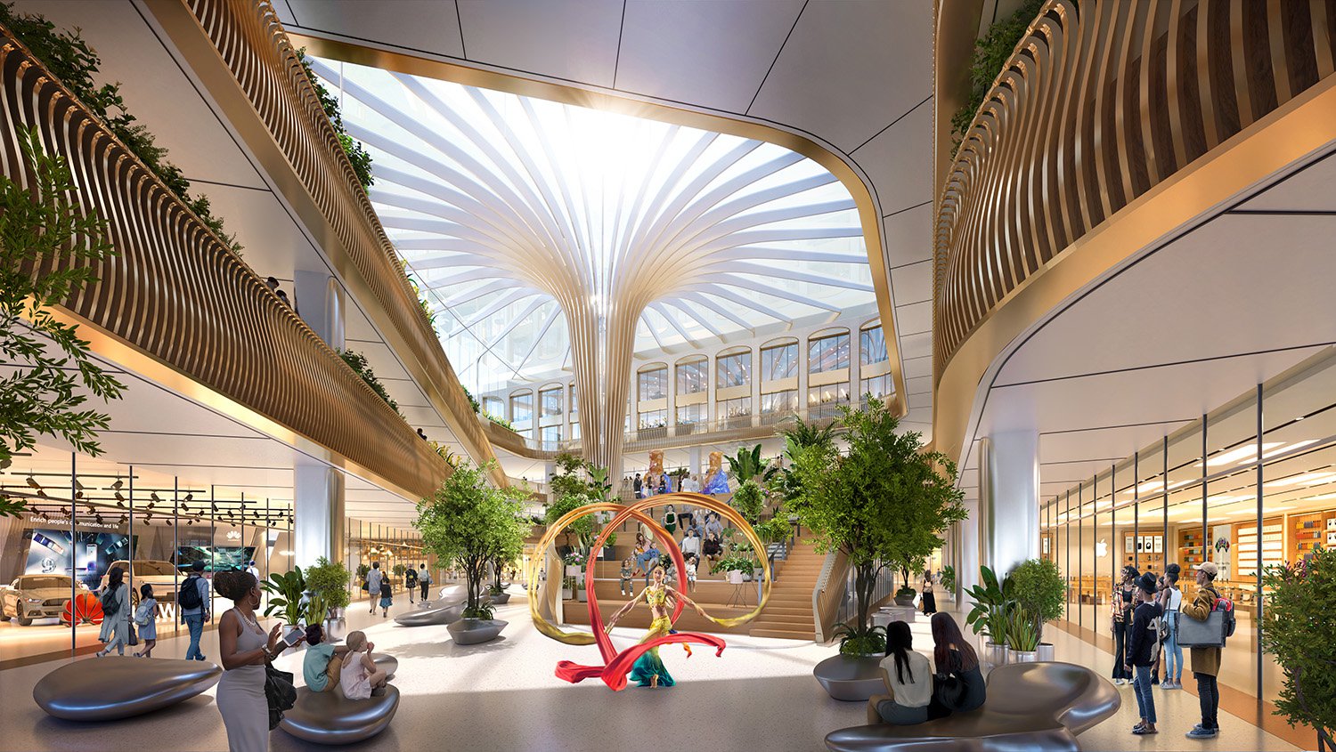 The unique architectural expression for the complex is inspired by the soaring vaults and elegant archways found in the neighboring cathedral. These distinct geometries are reinterpreted in a modern way to provide scale and rhythm for the buildings while using local limestone with bronze accents to establish a campus character among the three parcels. The two grand interior spaces have been designed to embody the spirit of the local culture. Termed the “Lotus Atrium” and “Lotus Gallery,” these multistory public spaces employ structural solutions inspired by the lotus flower that is the symbol for the city. All the buildings step as they face Honglou Plaza and the new central square, ensuring that the complex provides an active multilevel experience, resulting in a variety of heavily landscaped and programmed terraces that reinforce the key view corridors.