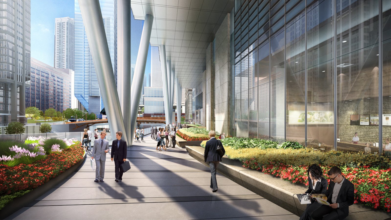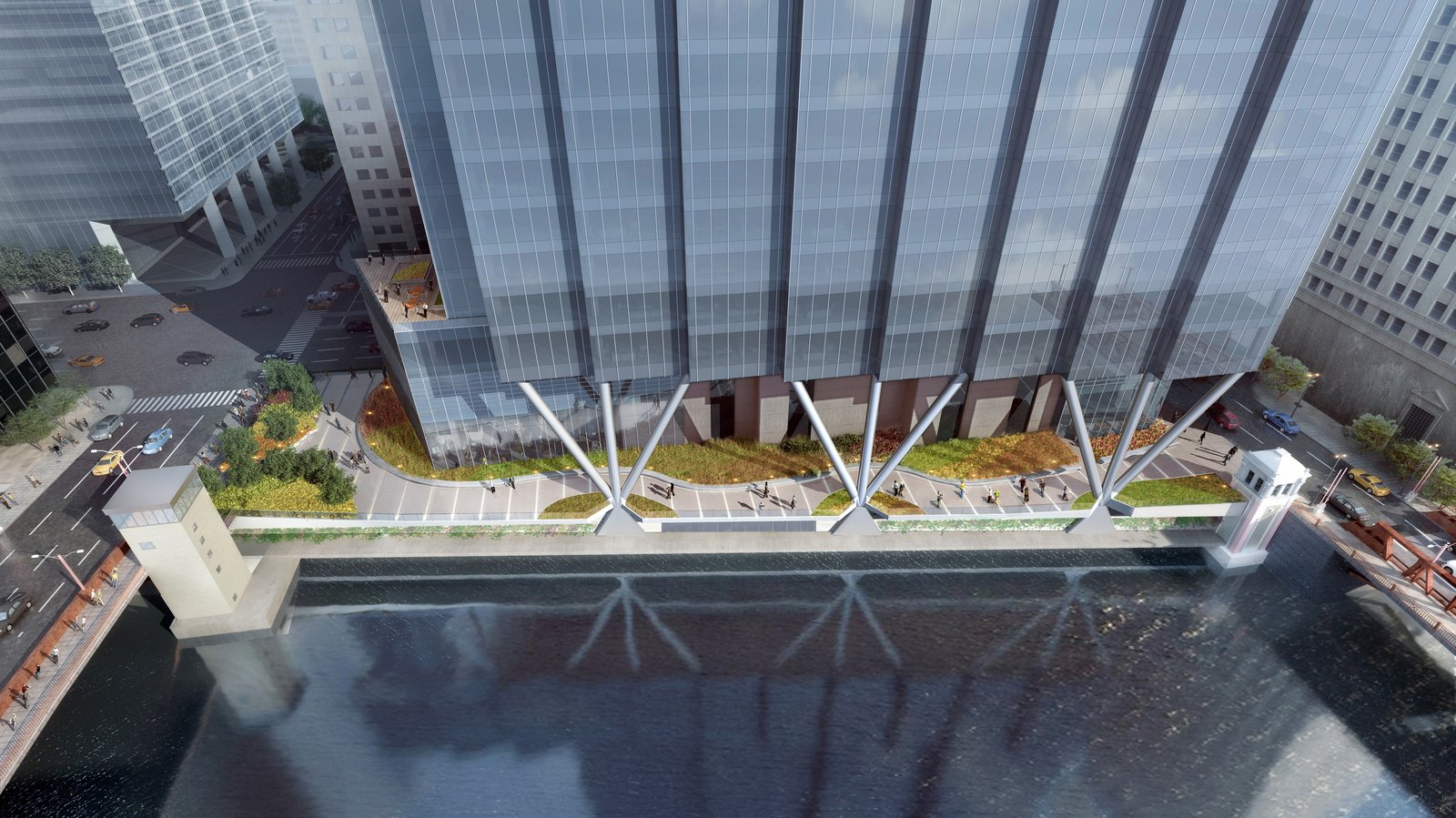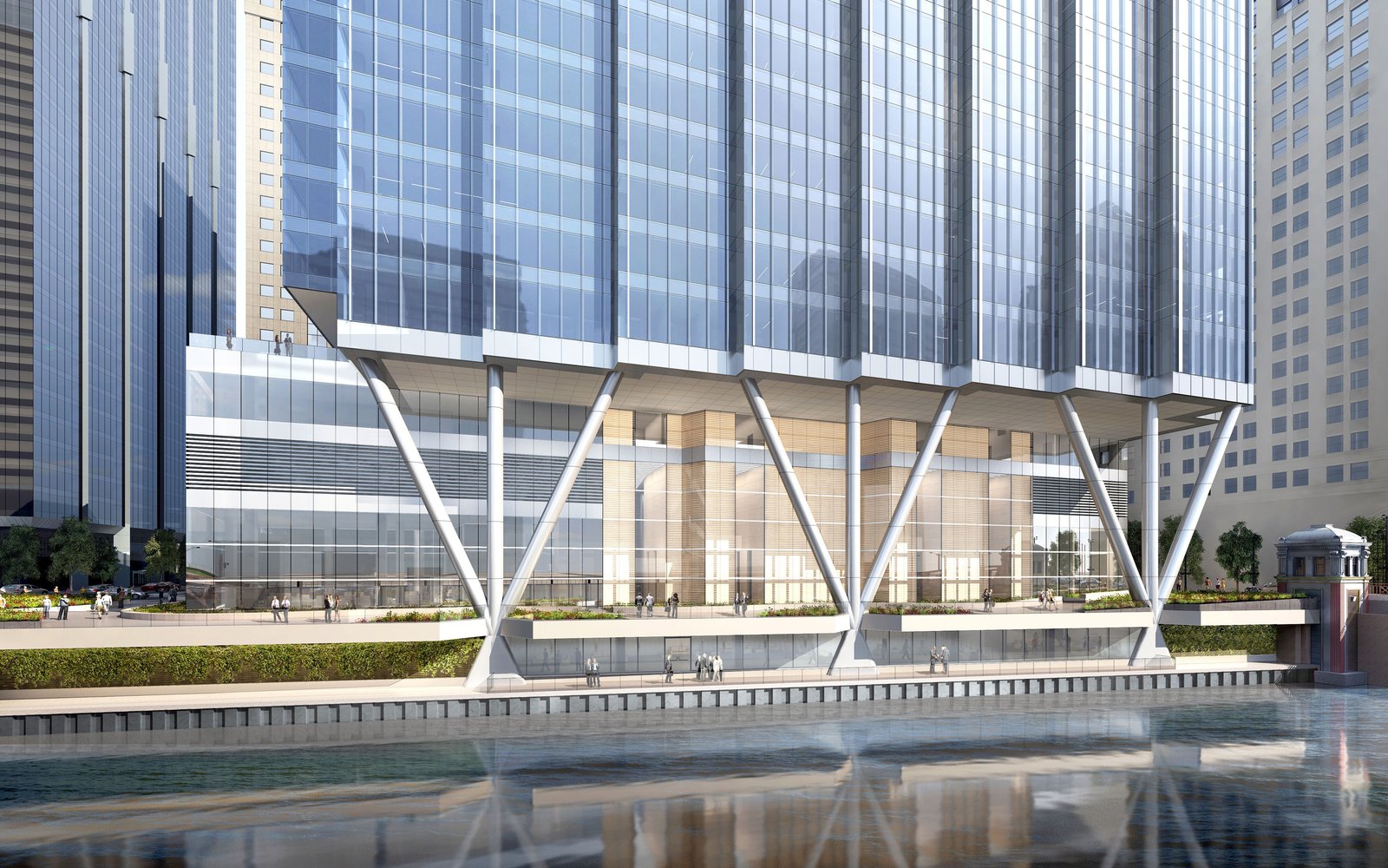 “One of the few office building sites in downtown Chicago bounded by three streets and the Chicago River, 110 North Wacker Drive is the last premier office site in Chicago offering unmatched views of and from the building.” said James Goettsch, FAIA, Chairman and CEO of Goettsch Partners. “The site’s trapezoidal shape allows us to provide a series of stepped projections on the western façade, enhancing views up and down the river, emphasizing the building’s verticality and providing the building with a distinct identity. At street level, almost half of the site is publicly accessible and features a soaring covered riverwalk, supported by a distinctive structural design.”