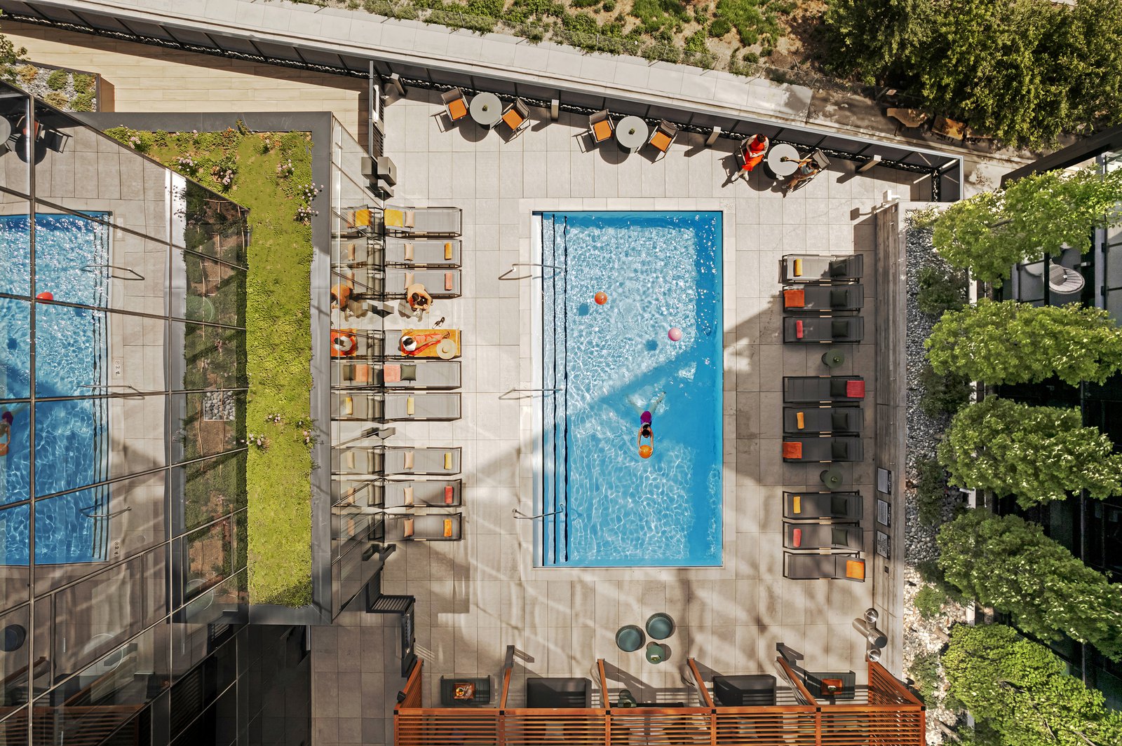 Coppia’s elevated amenities program is designed to extend resident’s living spaces, offering additional places to work, socialize, exercise, and unwind. Resort-style amenities such as a sun deck with swimming pool, outdoor bar, cabanas, and fitness center are available on the fourth floor. The main level boasts a 2,200-square-foot game room and bar area with arcade games, professional-grade golf simulator, and shuffleboard; plus, co-working space, dog park with dog spa, 24-hour concierge service, and generously sized bike storage.