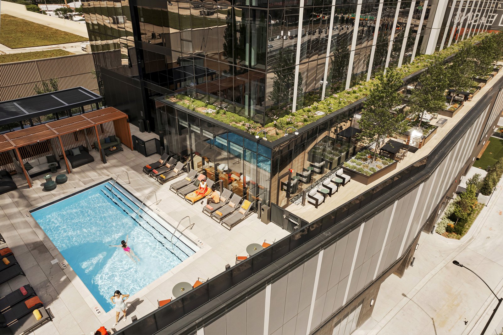 Construction on the 226-foot-tall high-rise was completed by Power Construction. At 19 floors and 298 units, the project totals 315,000 square feet with more than 24,000 square feet of amenity space. Village Green provides property management services; Goettsch Partners was the project’s design architect; Gensler led the hospitality-driven interior design concept. Onsite retail opportunities are available on the ground level.